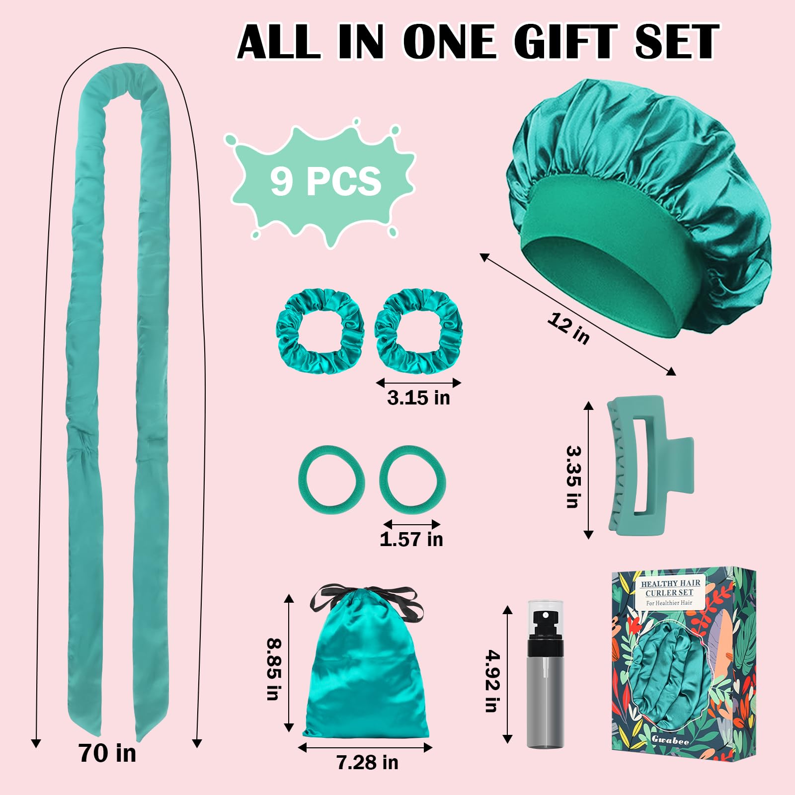 Thoughtful Set for Women: Our heatless curling set includes 9 items: 1 x 70-inch long satin curling rod headband, 1 x satin hair bonnet for sleep, 1 x hair clip, 2 x satin hair ties, 2 x elastic hair ties, 1 x satin storage bag, and 1 x spray bottle. This all-in-one curling rods set is packaged in an exquisite box, making it the perfect present for your wife, mother, daughter, friends, or colleagues