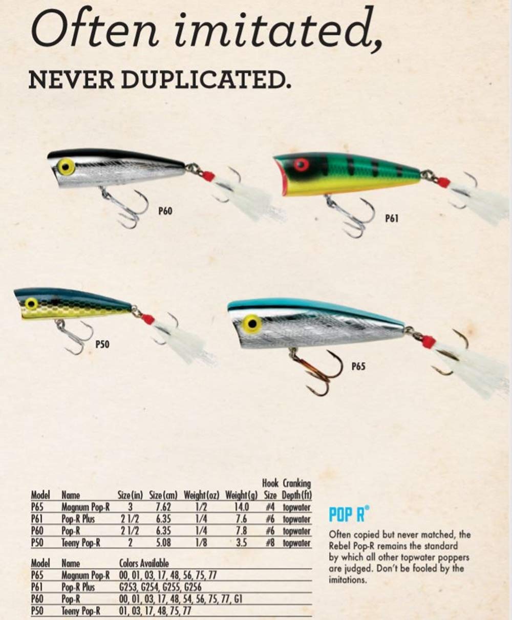 As with the standard Pop-R, the Magnum size features a dressed rear treble with hyper light-attracting strands of glitter filament for extra flash. This larger version creates more surface disturbance and is available in a variety of exclusive color patterns. The largest Pop-R in the Rebel line-up, the Magnum Pop-R creates tremendous surface disturbance to pull in bass and stripers from a long distance. The Pop-R is a legendary topwater bait that’s won hundreds of thousands of dollars for anglers in bass tournaments because the bait produces two distinctly different sounds and actions depending on if the angler is holding the rod tip high or toward the water.