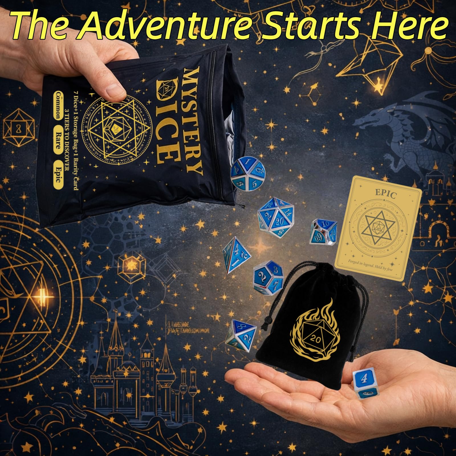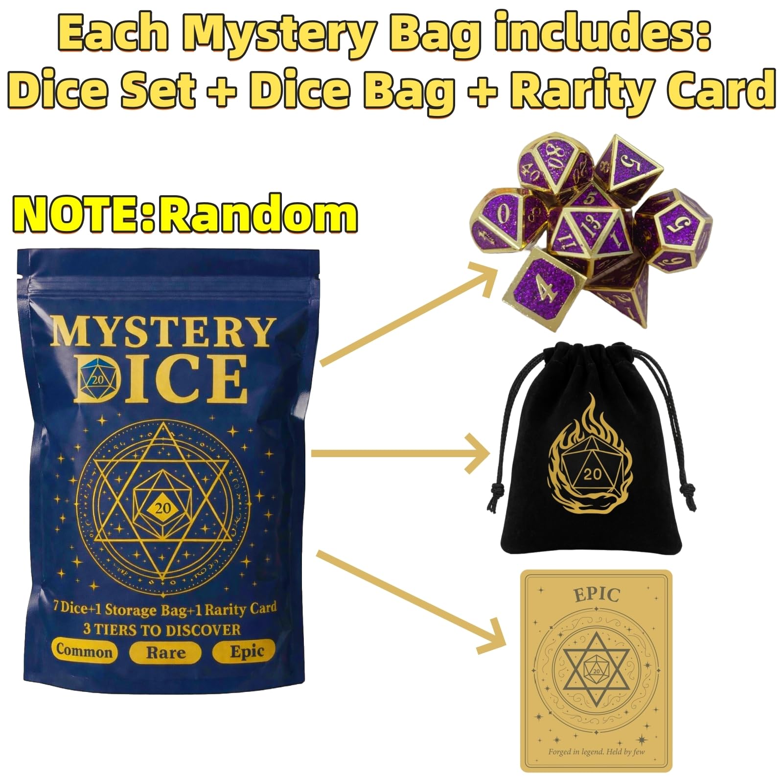 Complete Mystery Set – Each bag includes 7 polyhedral dice, 1 random dice bag, and 1 rarity card (Common, Rare, or Epic). Everything you need for your next adventure.