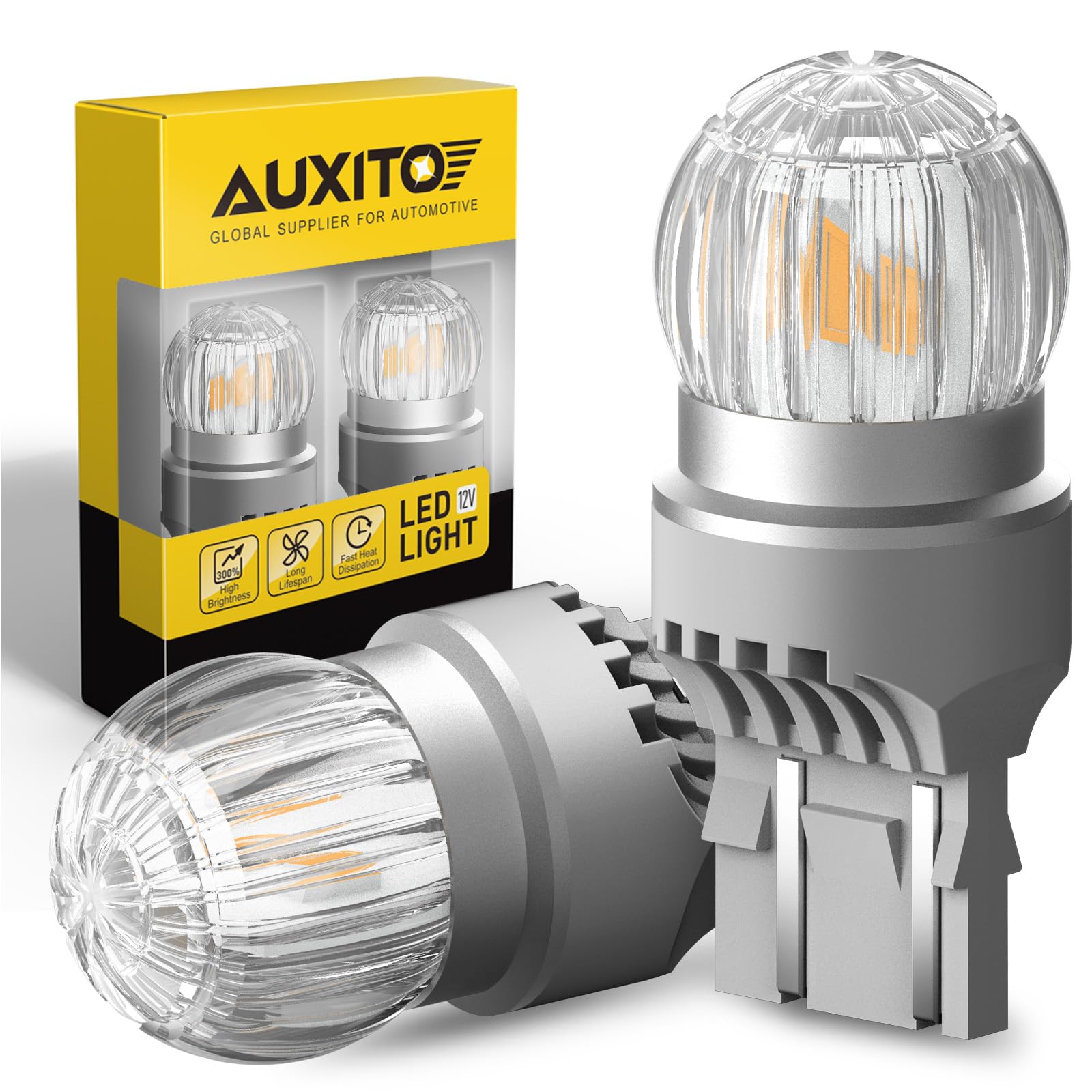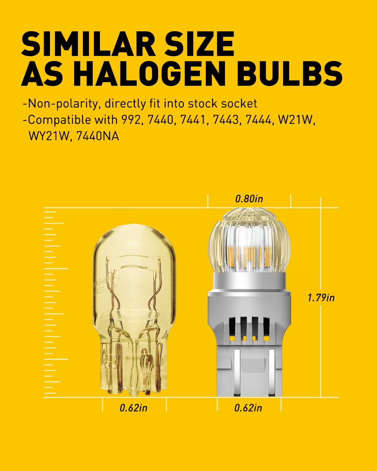 【Ultra Bright & Safer Upgrade】AUXITO 7443 led amber bulbs utilize newest powerful and high quality 3030SMD led chips. Generating 400% brighter output and larger lighting area than halogen, more noticeable but no dazzle when ready to turning. Keep safe