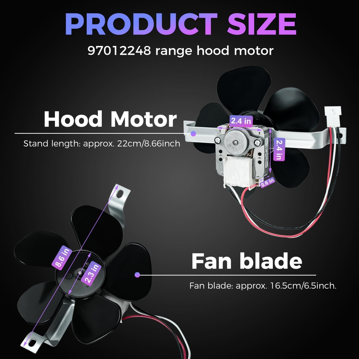 Compatible Models: 97012248 range hood motor replacement is fit for B-roan, Ken-more range hoods 422408, 423602, 424204, F402401, 23351644590. Stand length: approx. 22cm/8.66inch / Fan blade: approx. 16.5cm/6.5inch