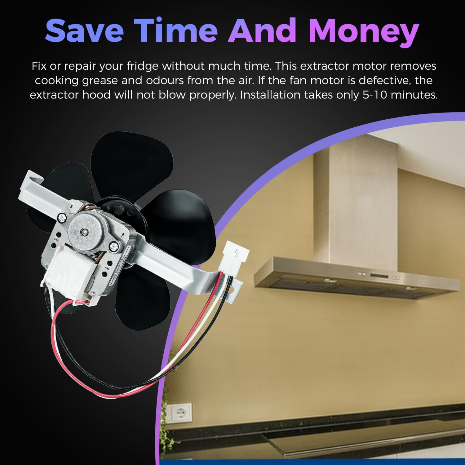 Save Time And Money:Fix or repair your fridge without much time. This extractor motor removes cooking grease and odours from the air. If the fan motor is defective, the extractor hood will not blow properly. Installation takes only 5-10 minutes. Note: Disconnect the power supply before installation and wear work gloves to protect your hands!