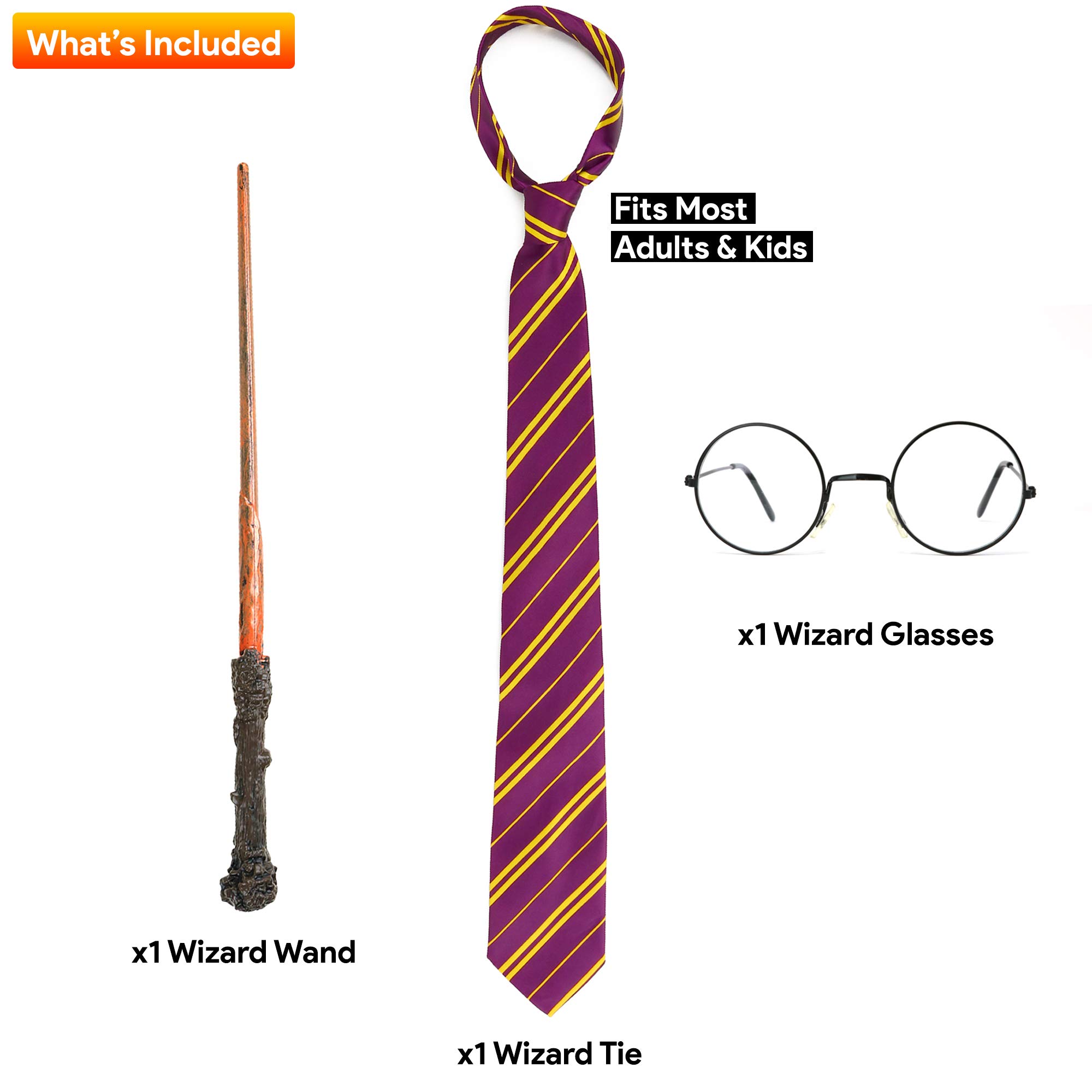 Skeleteen Witch and Wizard Accessory Set includes black glasses, a maroon and yellow tie and a wand.
