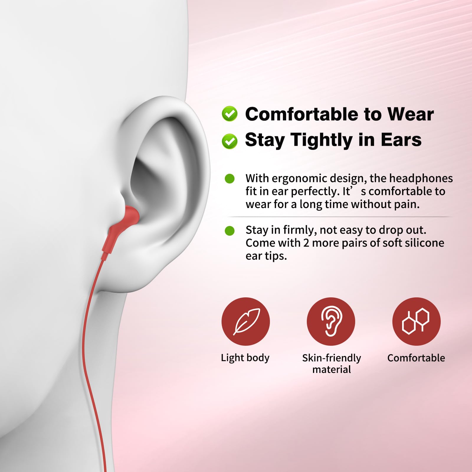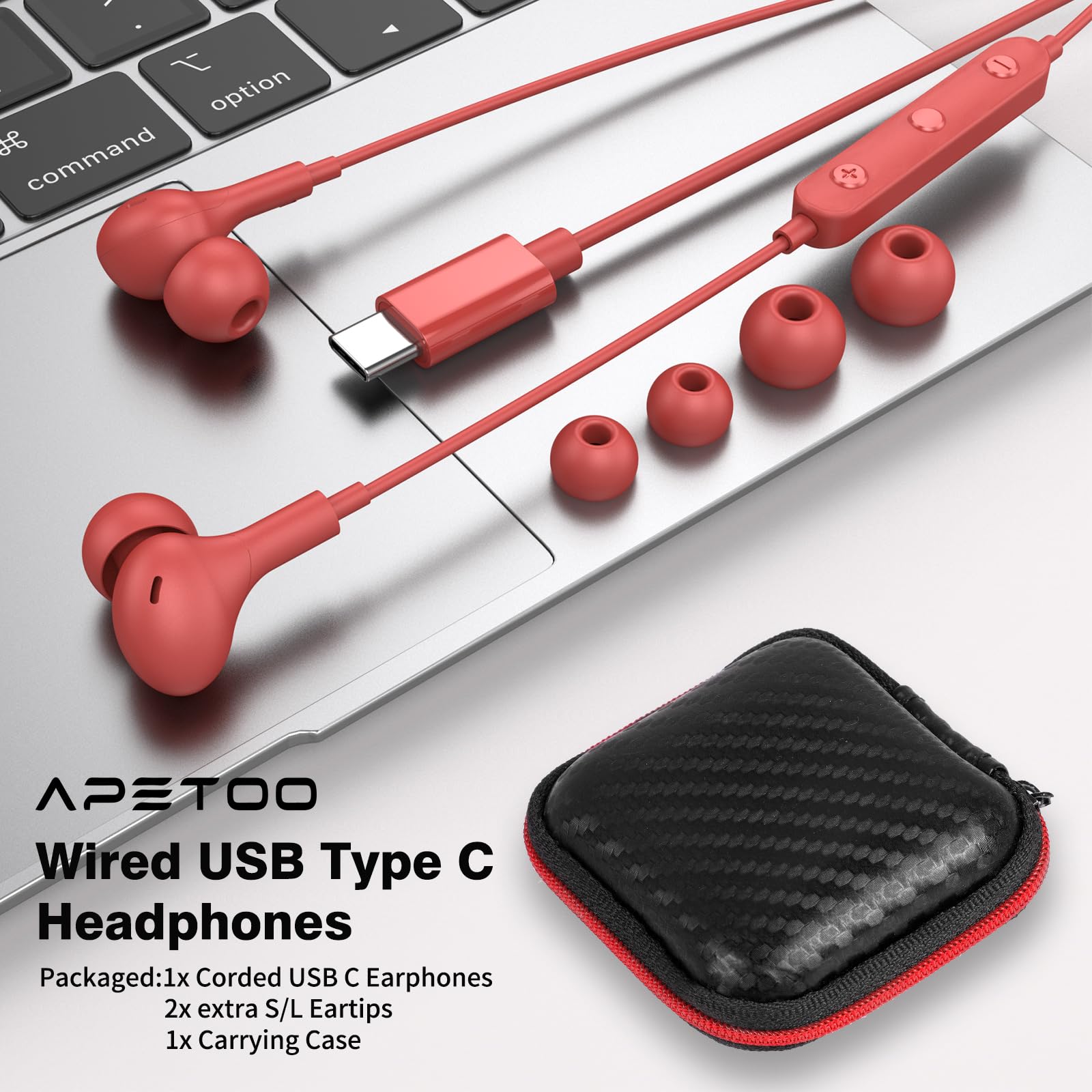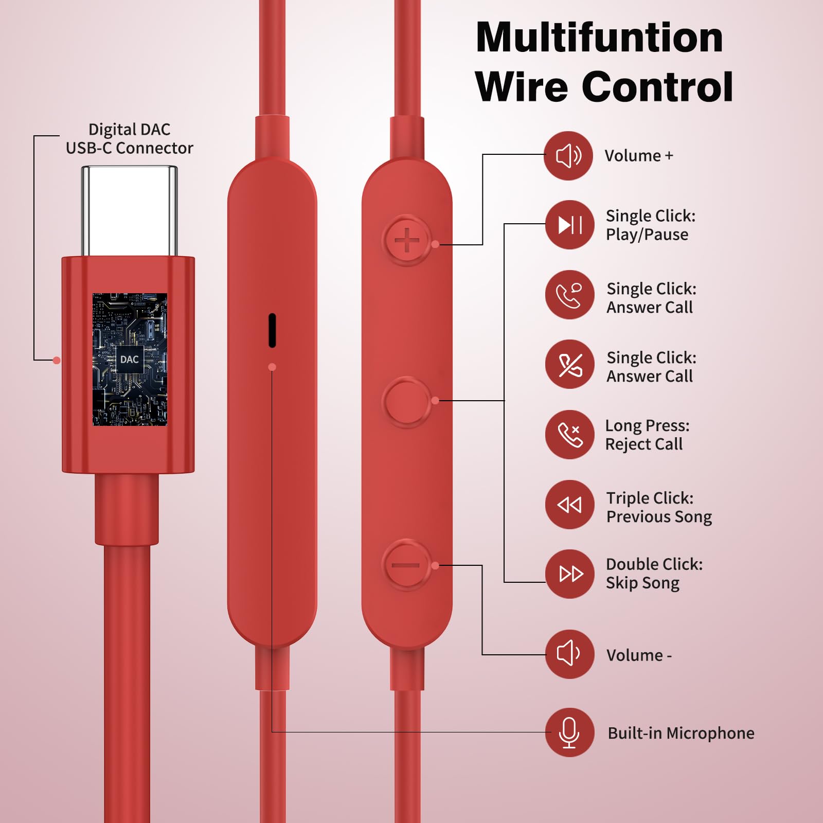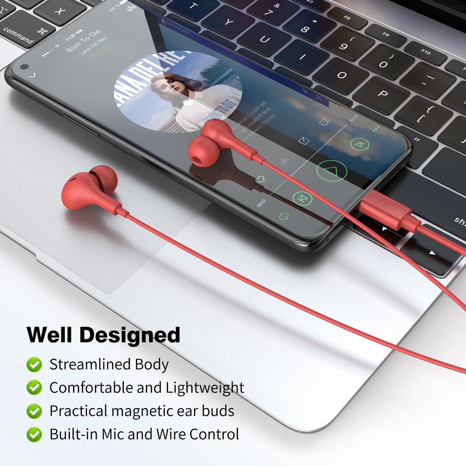 Comfortable and Magnetic Design: The USB C wired earbuds are designed fashionable. Differient sized soft silicone ear tips and streamlined ear buds body fits your ears perfectly; red color make the headphones noticeable and easy to find, also bring you brighter look; hidden magnets at the back of the earbuds bring more convenience to your life: wear it or hang around your neck freely when not use the earbuds