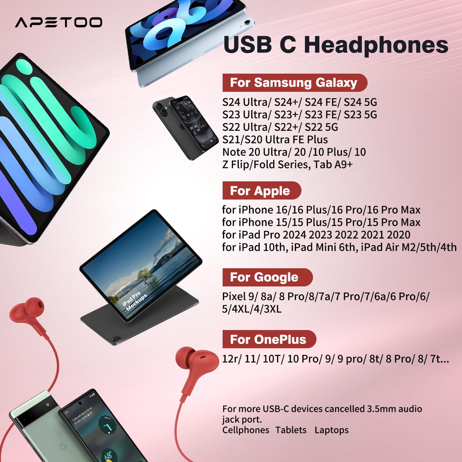 Wide Fit: APETOO USB C Headphones work with iPhone 16/16 Plus/16 Pro/16 Pro Max, iPhone 15/15 Plus/15 Pro/15 Pro Max, Samsung Galaxy S24 Ultra/S24+/S24, S23 FE/S23 Ultra/S23/S23+ 5G, S22/S22+/S22 Ultra 5G, S21 Ultra/S21 Plus/S21 FE/S21 5G, S20 FE S20 Plus S20 Ultra, Note 20 Ultra/20, Note 10 Plus/10, Galaxy A53 A54 A34 A35, Z Flip5/4/3/2, Z Fold5/4/3/2; Pixel 8 7 7 Pro 6a 6 Pro 6 5 4 4XL 3 3XL 2 2XL; OnePlus 10T 9 Pro 9 8T 8 Pro 8 7T Pro 7T 7 Pro 7, 6T, Nord and more usb c device