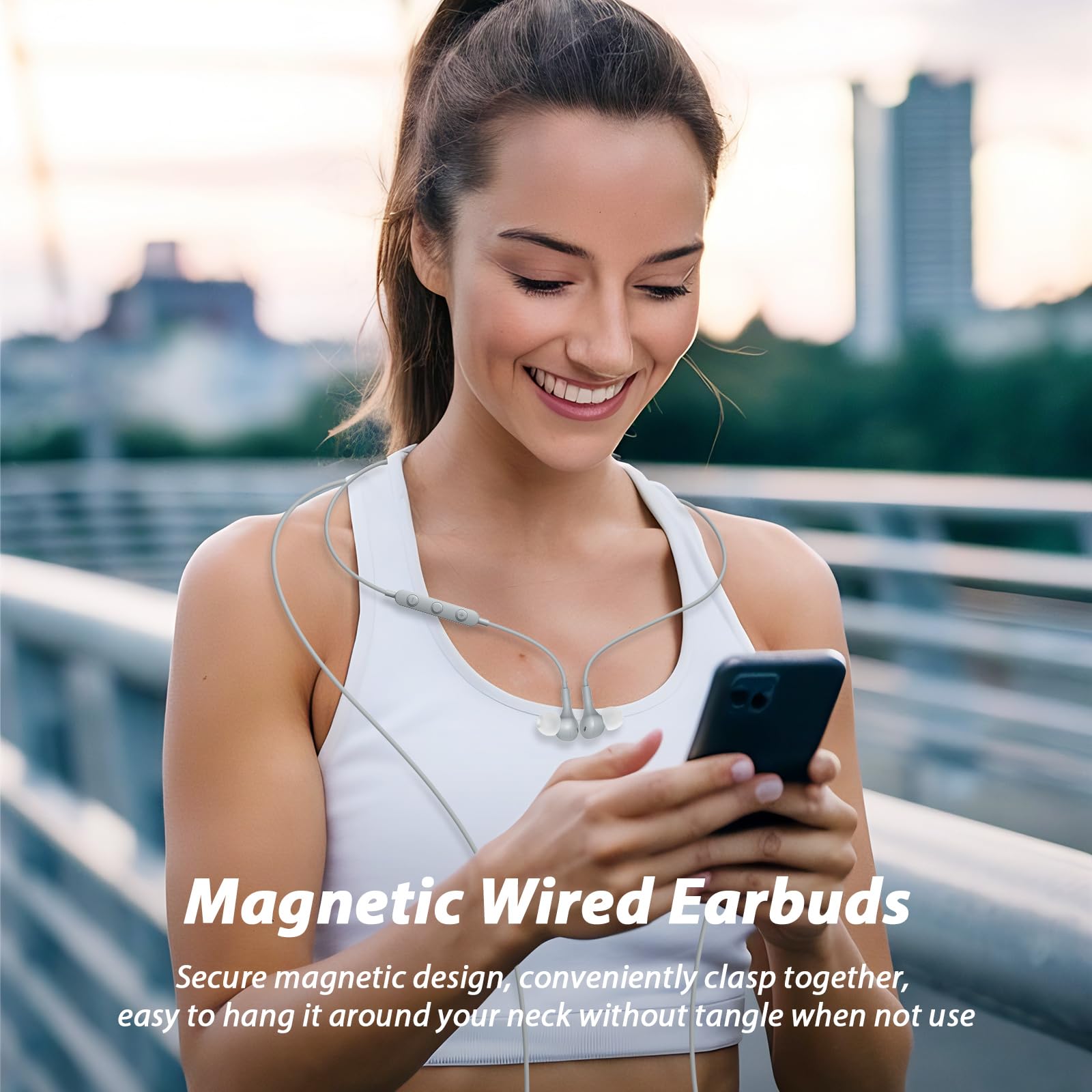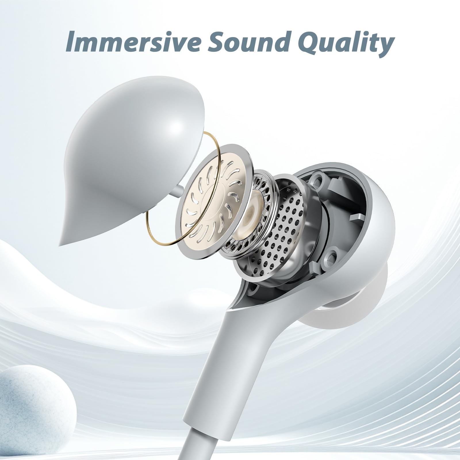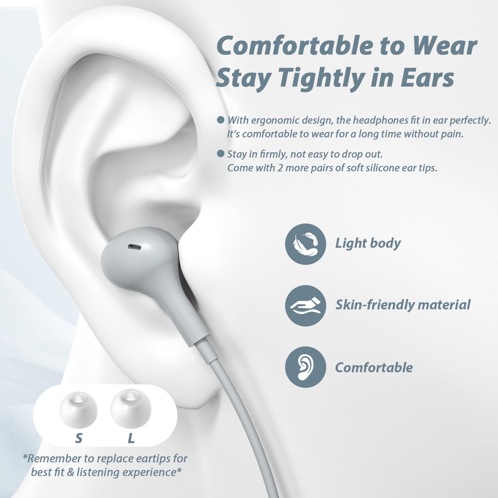 Comfortable and Magnetic Design: The USB C wired earbuds are designed fashionable. Different sized soft silicone ear tips and streamlined shaped body fits your ears perfectly; new sky-grey color is probably the one easiest for match and into your style rotation; Hidden magnets at the back of the earbuds bring more convenience to your life: wear it or hang around your neck freely