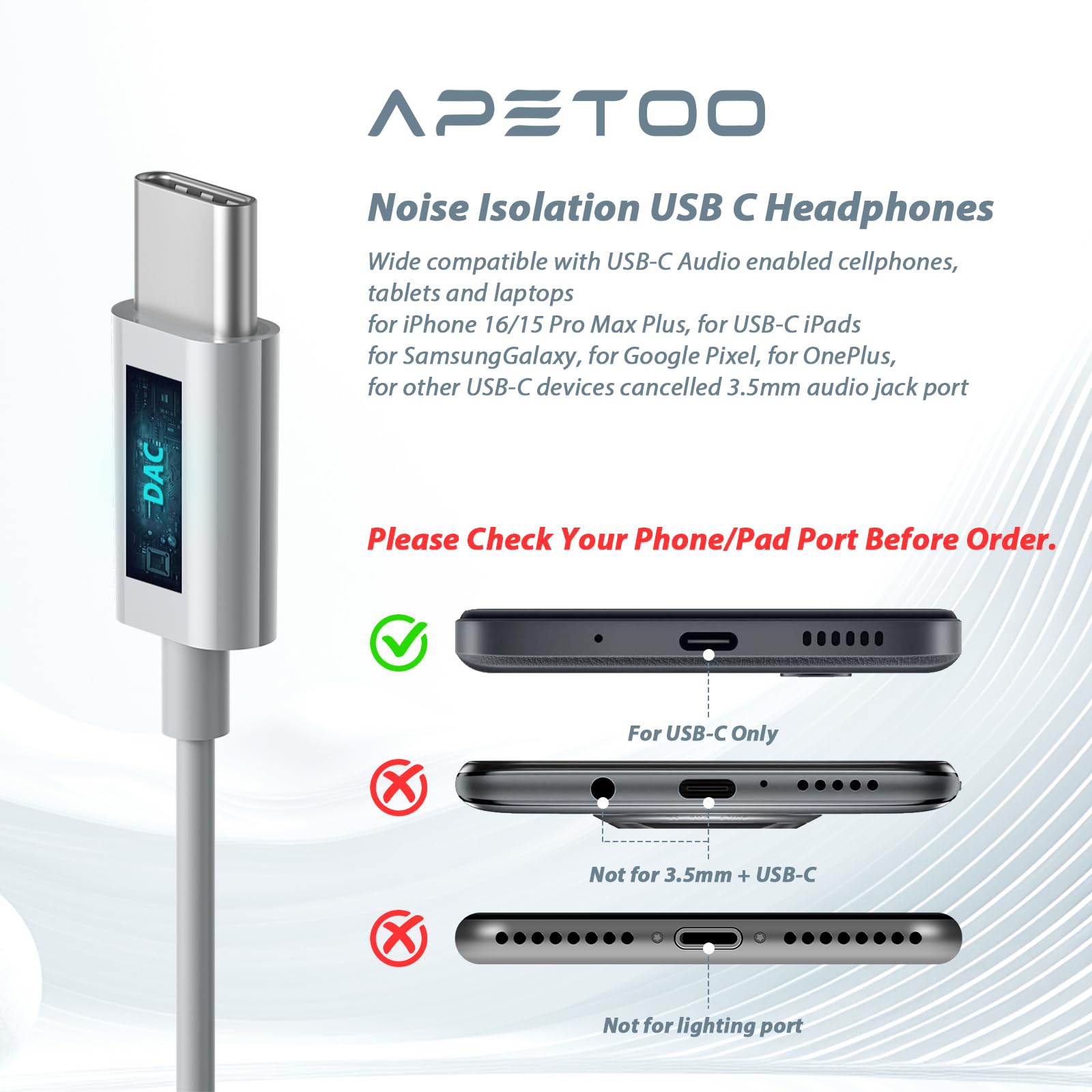APETOO USB C Headphones for iPhone 15 Pro/15 Pro Max/15/15 Plus, iPhone 16 Pro/16 Pro Max/16/16 Plus, Samsung S24 FE Ultra/S24+/S24, S23 FE/S23 Ultra/S23/S23+ 5G, S22/S22+/S22 Ultra 5G, S21 Ultra/S21 Plus/S21 FE/S21 5G, S20 Fe Plus Ultra, Note 20 Ultra/20, Note 10+/10, Galaxy A53 A54 A34 A35, Z Flip5/4/3/2, Fold5/4/3/2; Pixel 9 8 7 7 Pro 6a 6 Pro 6 5 4 4XL 3 3XL 2 2XL; OnePlus 10T 9 Pro 9 8T 8 Pro 8 7T Pro 7T Nord; for USB-C iPads, cellphones, tablets and more USB C devices