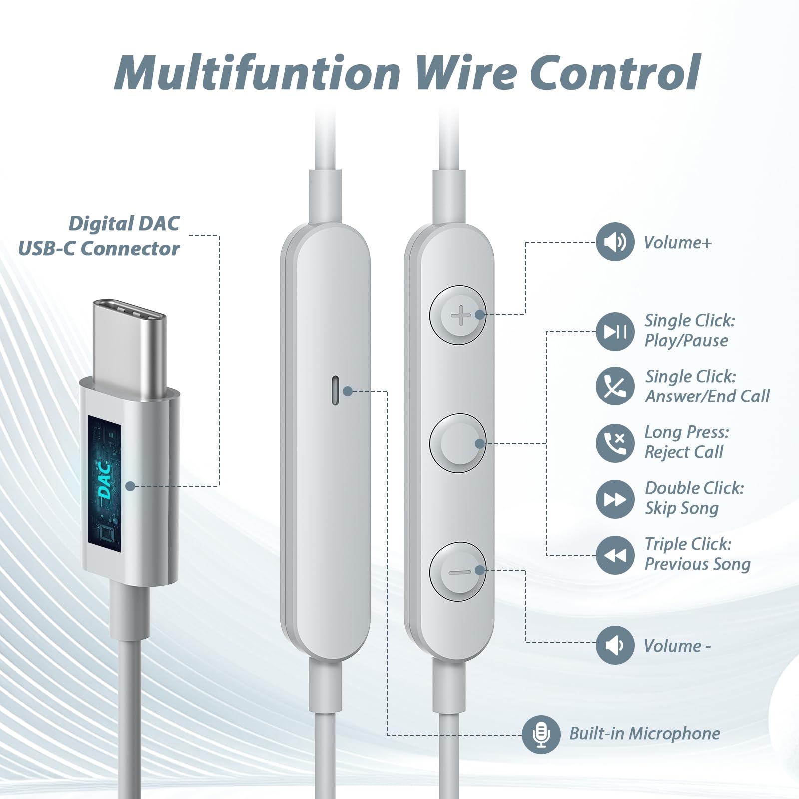 Built-in Microphone and Wired Control: The Type C earphones has built-in microphone and in-line control, very convenient to pick up/hung up calls. It also supports volume control and the change of next/previous song. No need to hold the phone, just get access to the wire control on the go