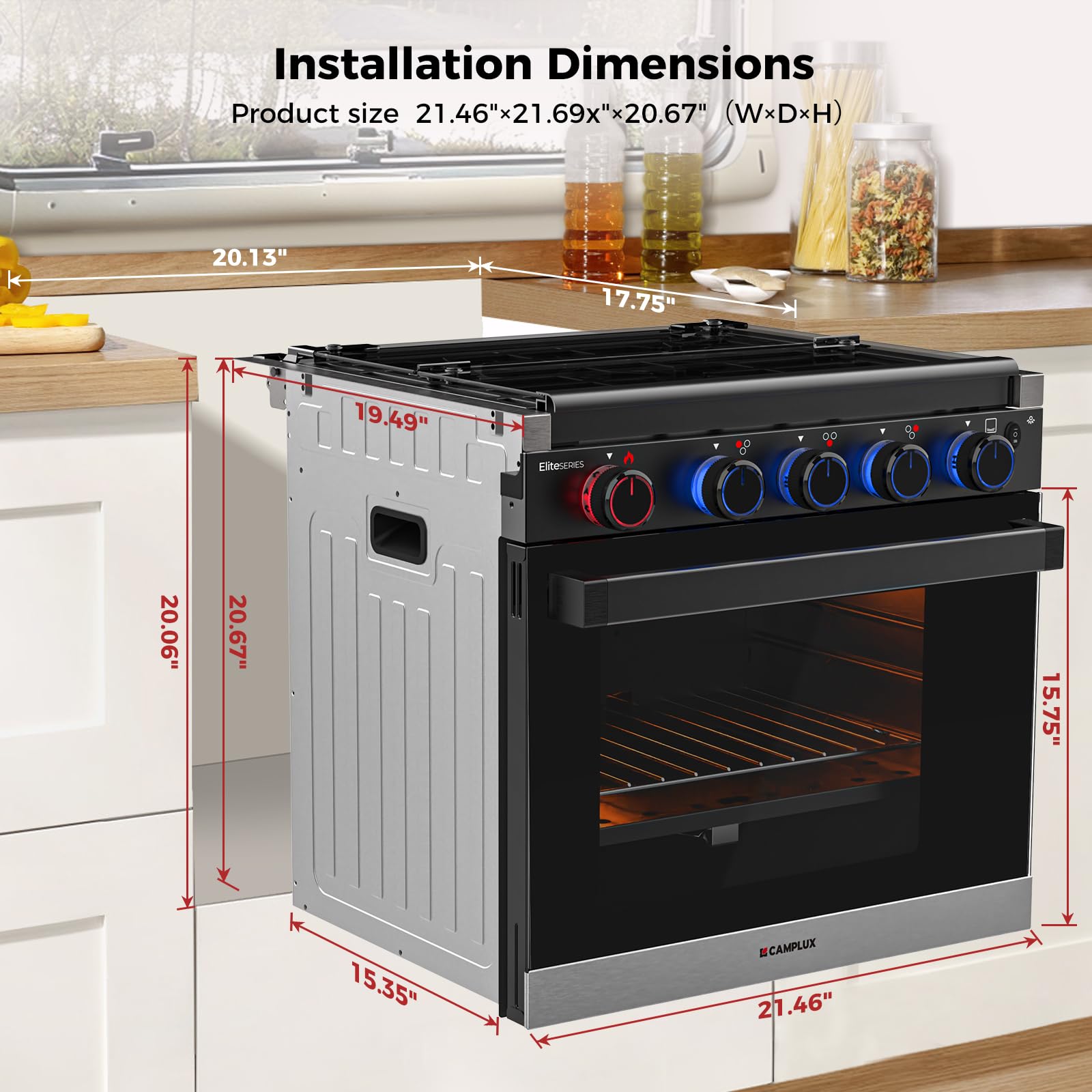 Safety First: CSA certified and compliant with North American standards. The oven and stove all have a safety cutoff valve to prevent fire hazards and rotary piezo ignition to ensure safe lighting and prevent accidental ignition by children