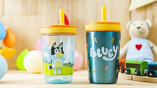 This leak-proof tumbler set from Zak Designs makes hydration fun for any fan of Bluey! Durable Materials: The set includes two different tumblers, one made from plastic and one made with double-wall stainless steel; both are durable enough to use every day. The comfortable straws are made from silicone. Leak-Proof Straw: The straw has a built-in valve that allows liquid to flow when drinking and prevents spills when the tumbler is tipped over. It's perfect for travel or for young children graduating from sippy cups. Hydrate Anywhere: Choose lightweight plastic or double-wall stainless steel, whichever suits the situation! The tumblers won't splash or leak, making them ideal to take on the go. At home, you don't have to worry about spills around papers or electronics, and drinks stay easily accessible through the straw. Specifications: 1 plastic tumbler (15 oz), 1 stainless steel tumbler (12 oz), 1 additional sipper and straw. Made of durable plastic, stainless steel, and silicone. Lids and plastic tumbler are top rack dishwasher safe, hand wash stainless steel tumbler; do not microwave. Character: Bluey.