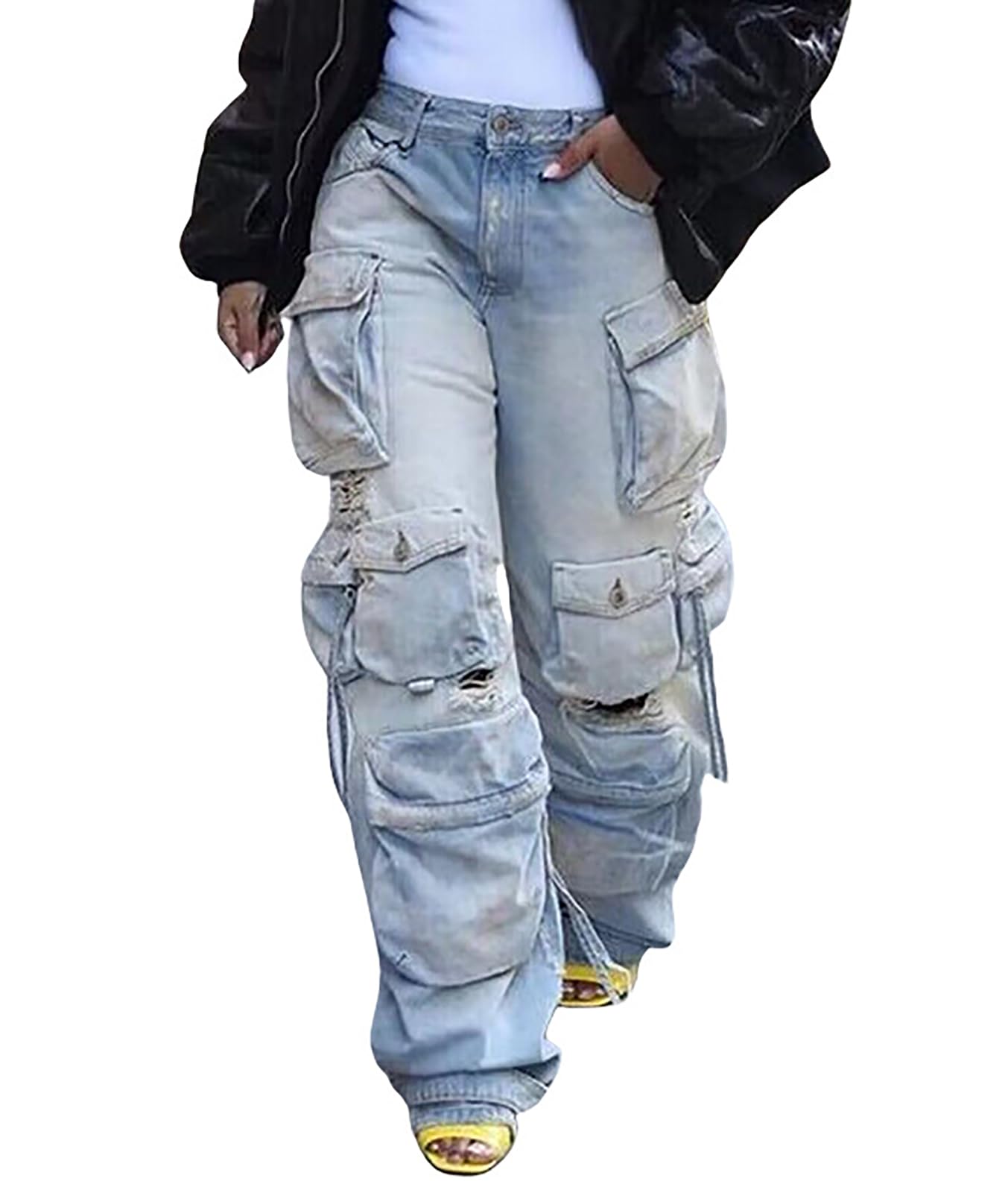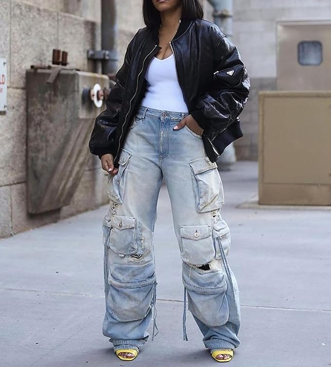 Feature:Casual, Vintage, Denim, Streetwear, Baggy, Y2K, distressed, multiple pockets, Straight Leg jeans, wide leg jeans,high waisted.