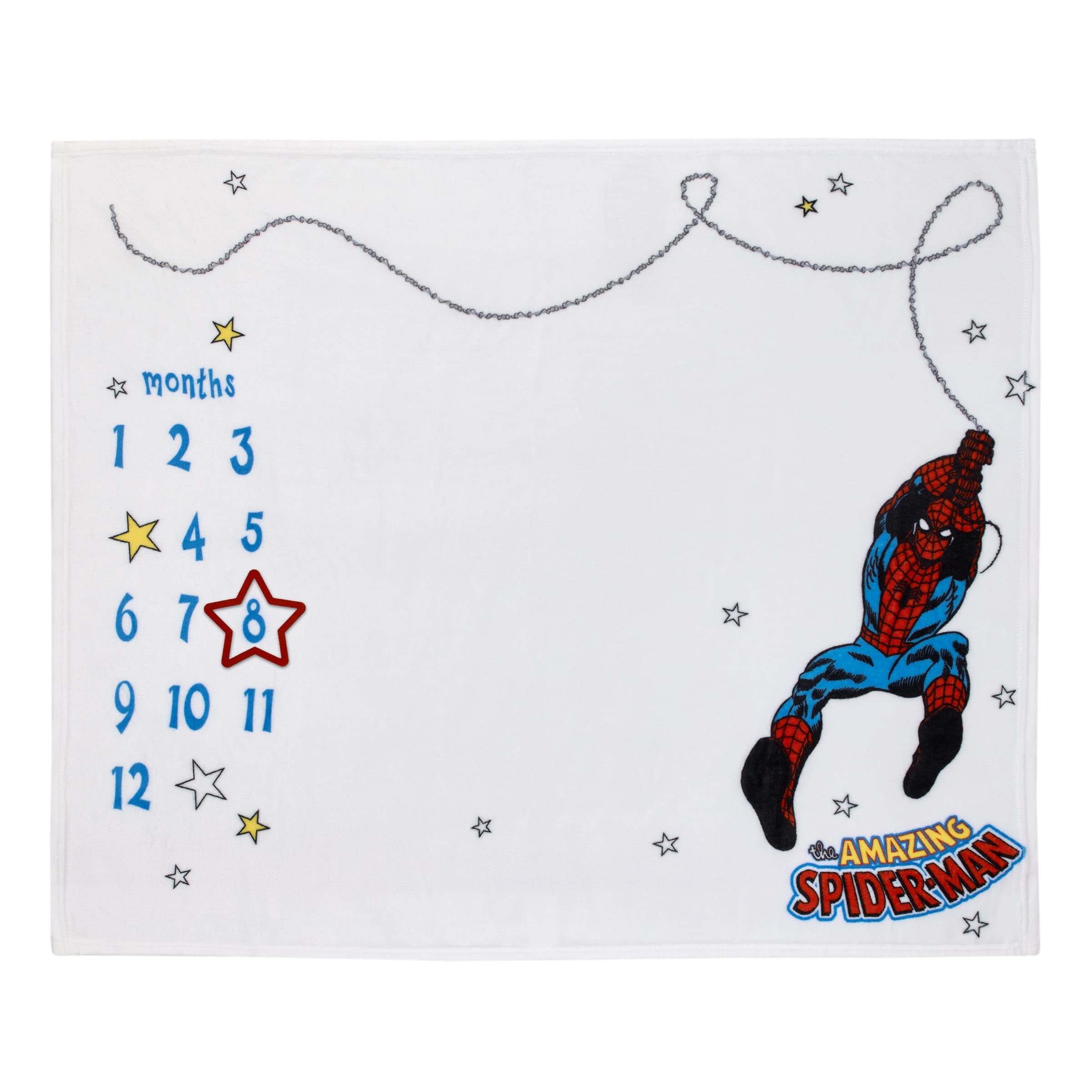 The Amazing Spiderman swings through the stars and sky on this Milestone Baby Blanket! Spiderman is featured in red and blue on a plush white blanket. Designed to create the perfect photo opportunity and capture milestones for each month. Document baby's progress as they grow! Includes a red felt star cutout to place on the month. Measures 40" x 50", and makes a wonderful gift! Machine washable for easy care!