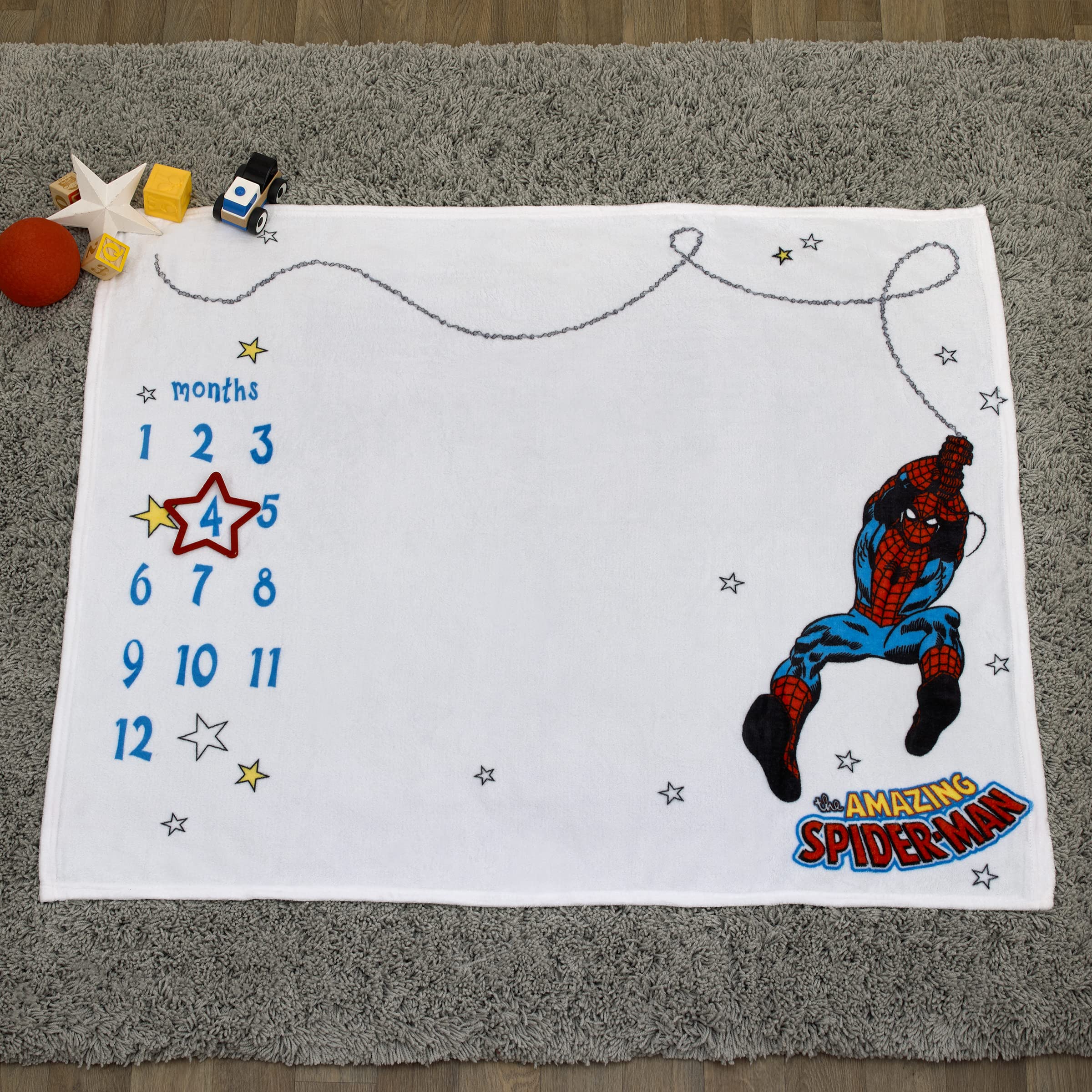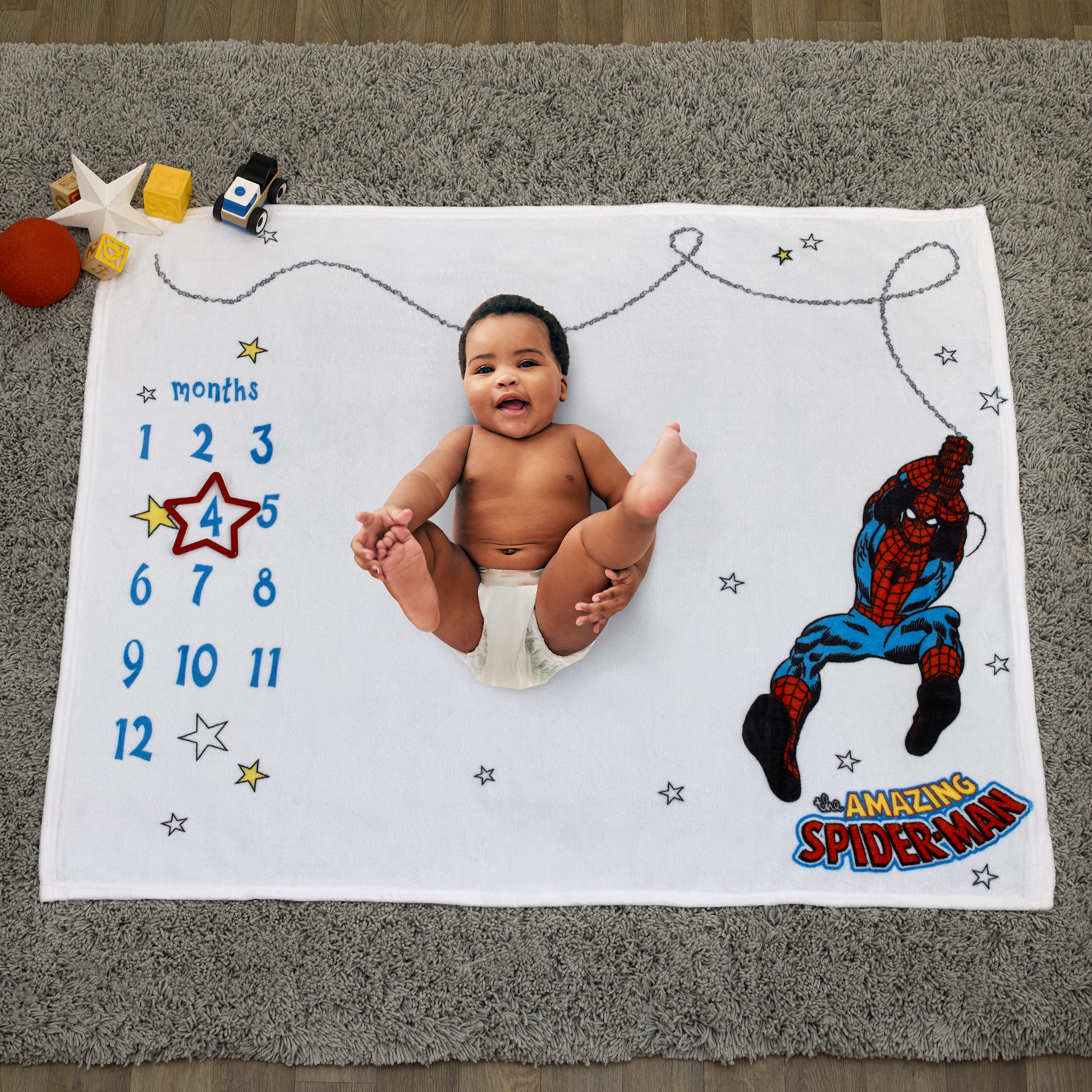The Amazing Spiderman Baby Blanket is designed to create the perfect photo opportunity and capture milestones for each month