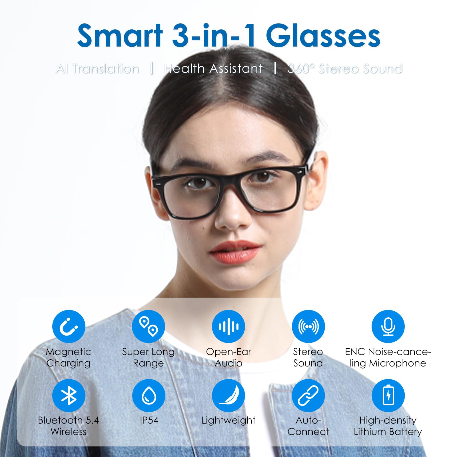 【3-IN-1 AI GLASSES】: ①Your AI Assistant powered by ChatGPT, Real-time Translation and Voice Recorder; ②A Pair of Good OWS Noise Reduction Earbuds; ③A Pair of Good Clear-lens Glasses for Men & Women