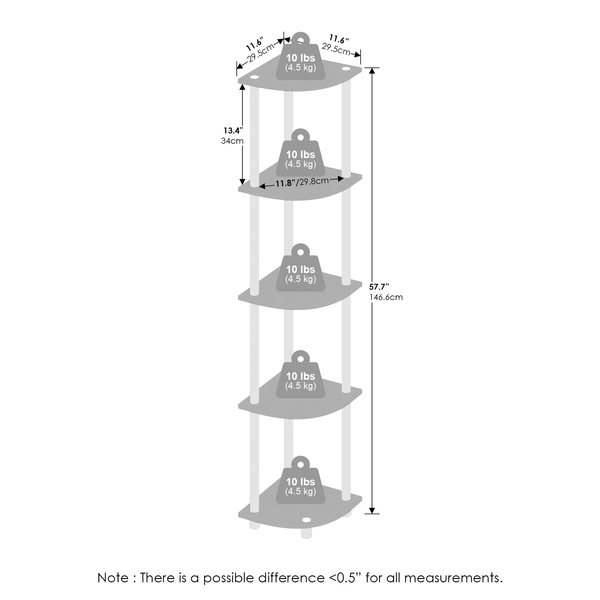 WEIGHT CAPACITY: Each shelf of this 5-tier display shelf holds up to 10 lbs; total unit supports up to 50 lbs