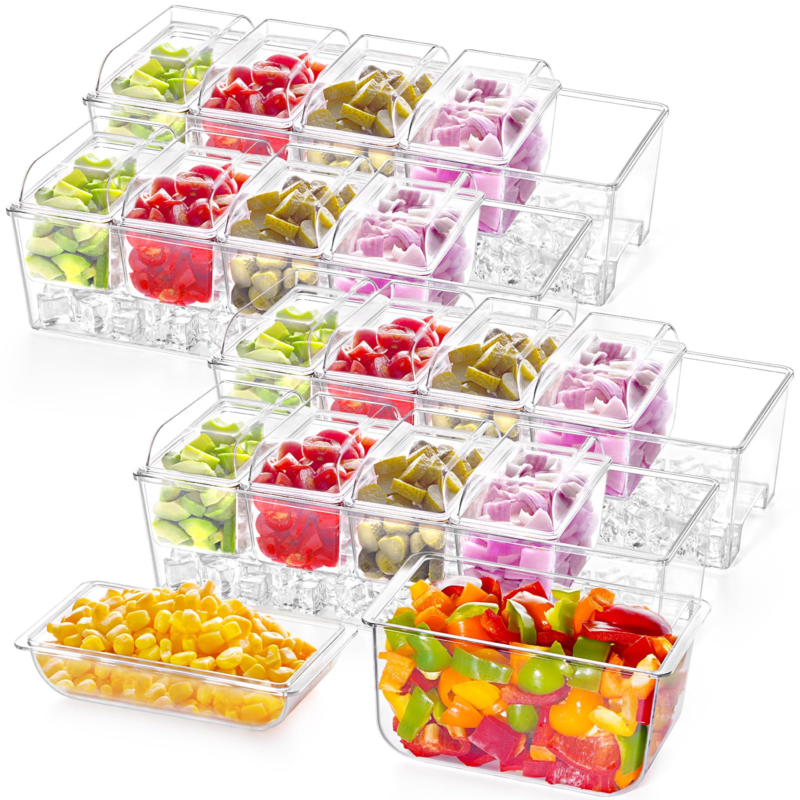 Large Capacity: The chilled serving tray measures 16" × 5.7" × 5.2" and comes with 5 removable compartments. Each compartment with a lid measures 5.7" × 3.1" × 3.9" and can hold approximately 2.5 cups (20 oz). The clever design allows for easy detachment and individual use of each compartment