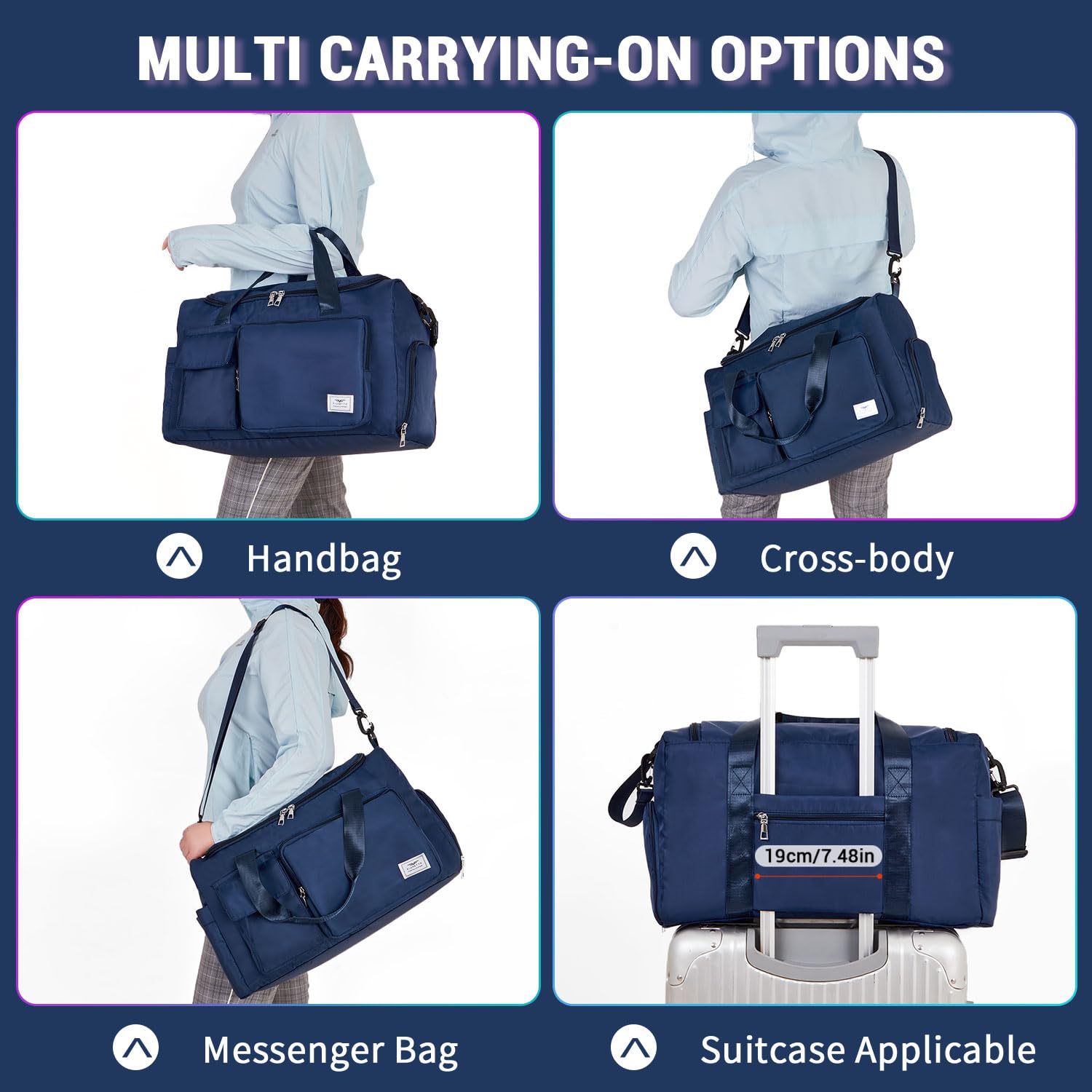 : The size of this travel bag is 18''×11''×11'', ideal as a carry on bag. With additional adjustable shoulder strap & integrated trolley sleeve, the tote bag can be carried with you everywhere, making your travel a breeze