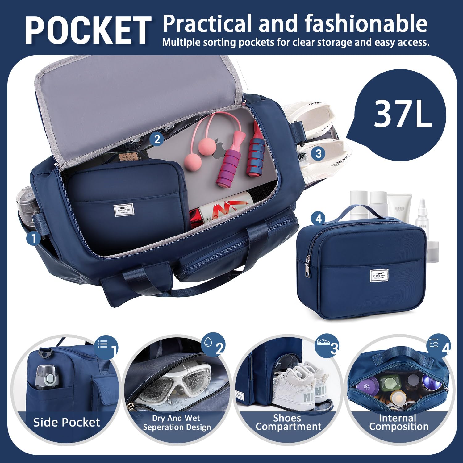 Wet Pocket & Shoe Compartment: The wet pocket is perfect for storing sweaty clothes or towels after your workout; The shoe compartment allows you to easily store and access your gym shoes without dirtying the main compartment