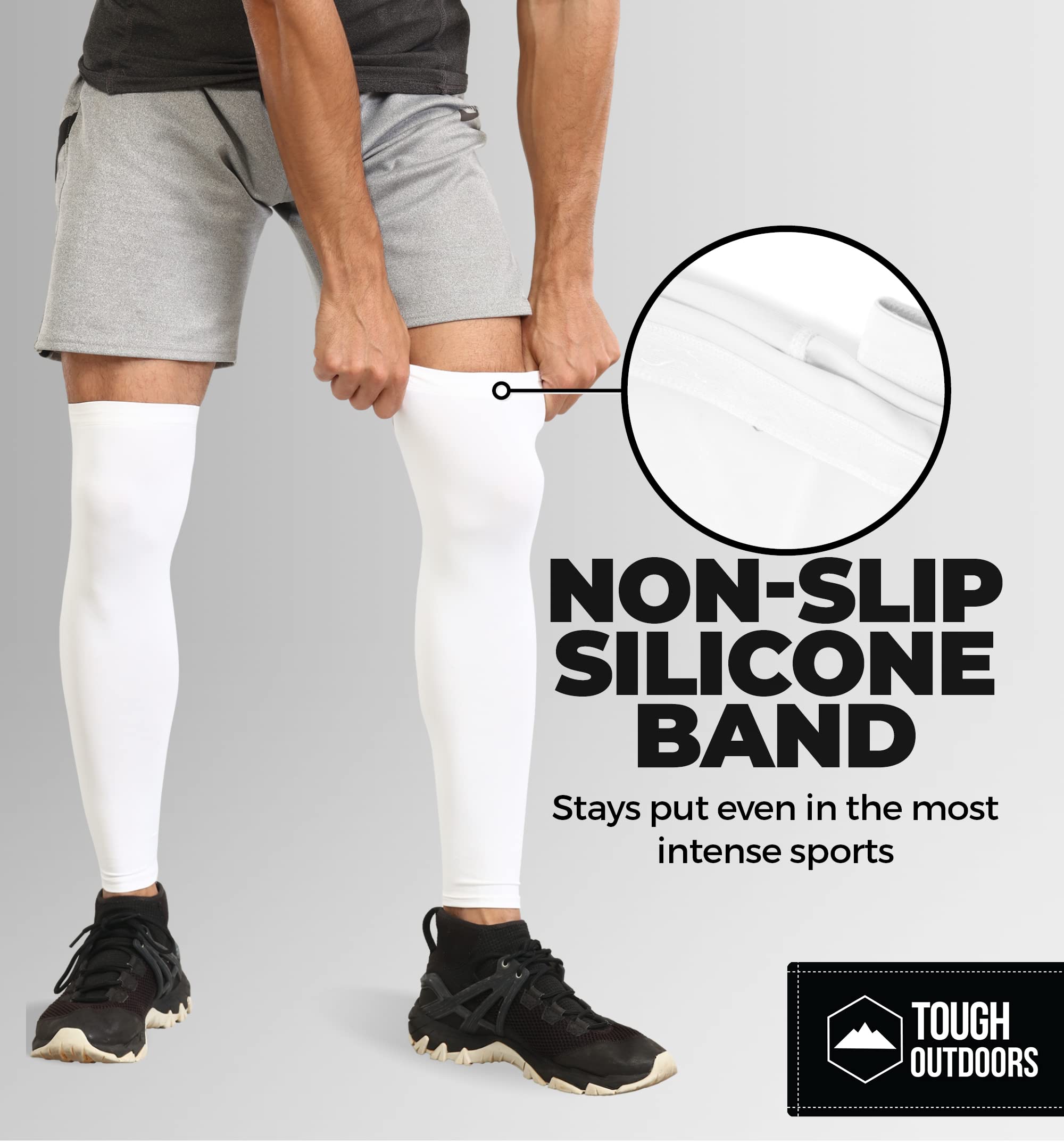 No-Slip, All Grip Fit: These compression leg sleeves for men stay in place. Whether it’s a full leg sleeve or football leg sleeves, silicone bands keep your focus on the game.