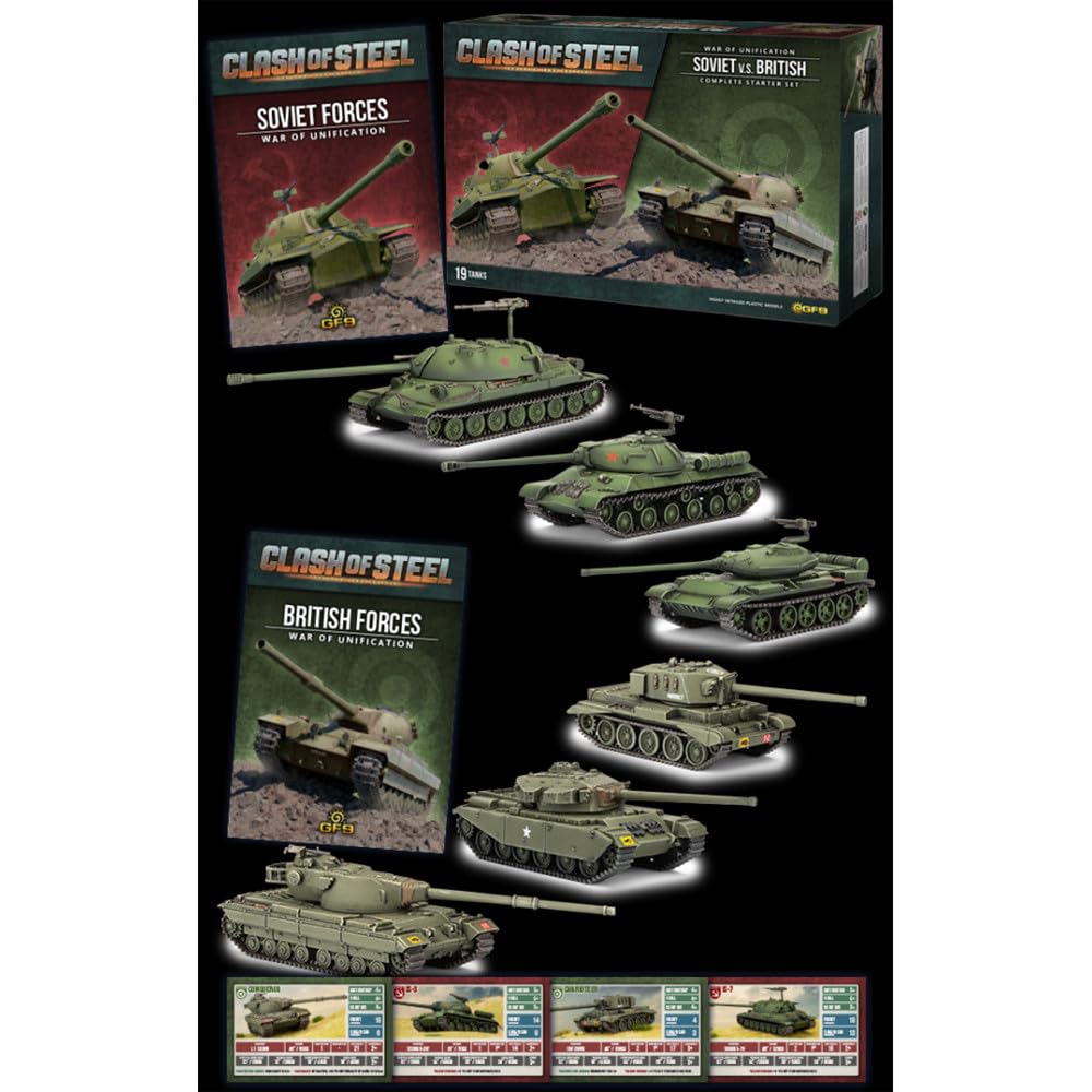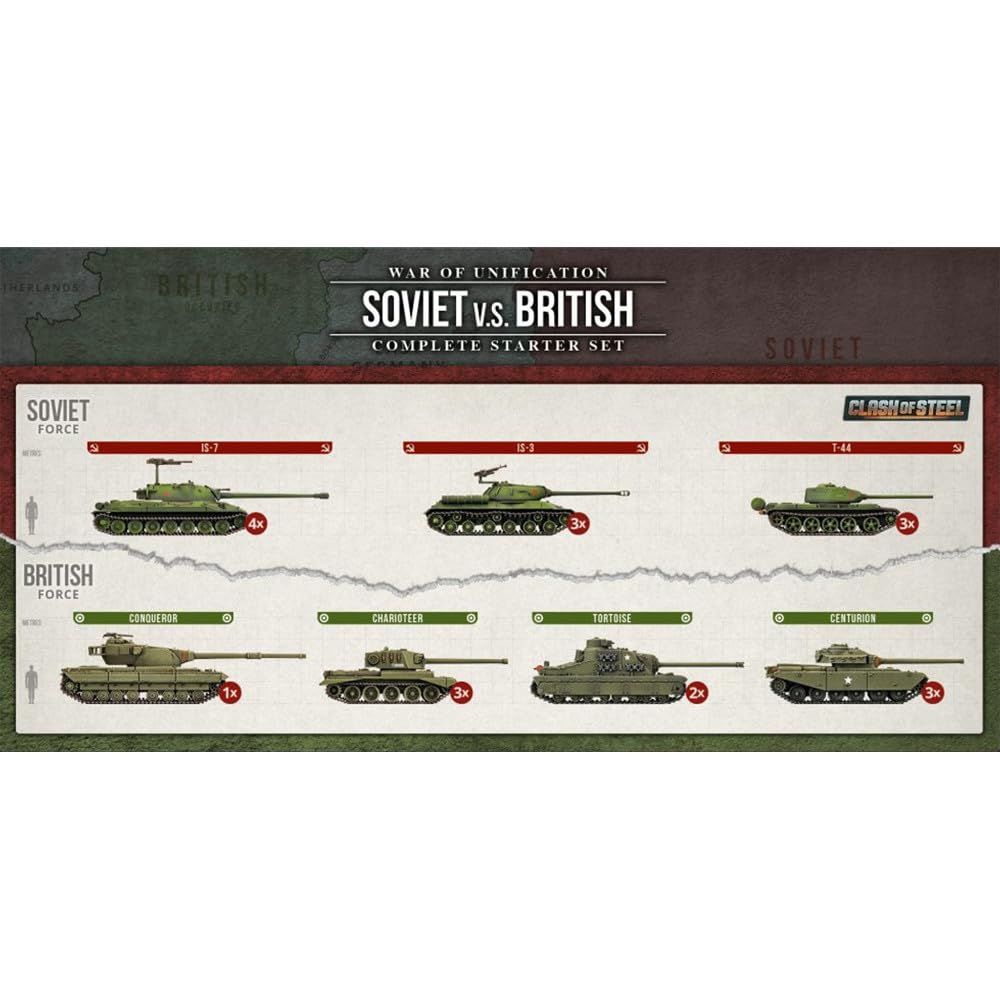 Clash of Steel: War of Unification: Soviet vs British Welcome to Clash of Steel. It's 1948 and the war has started again. Based on an Alternative History where the war in Europe finishes in 1944 with the surrender of Germany, but restarts just four years later in the face of Soviet aggression. Players take to the tabletop with one of four initial nations in Epic Tank-On-Tank Combat using Highly Detailed Multi-part Plastic Miniatures, battling over objectives in an attempt to control the battlefield and defeat their enemies. Featuring Dynamic Mission Based Game Play to ensure that every battle is unique and cinematic. This Starter Set contains everything a player needs to get started, including rules, miniatures, dice, tokens and much more. Plastic components. 1:100 Scale Contents: 9 British Tanks ‣ 1 Conqueror ‣ 3 Centurion ‣ 2 Tortoise ‣ 3 Charioteer 10 Soviet Tanks ‣ 4 IS-7 ‣ 3 IS-3 ‣ 3 T-44 24 Tank Commanders Decals Complete Rulebook Quick Start Rules 20 Dice 2 Force Booklets 25 Unit Cards 34 Tokens 3 Objective Markers 2 Victory Point Dials 26 Tactics Cards 6 Mission Setup Cards 9 Mission Rule Cards 22 Objective Cards Miniatures are supplied unpainted. Preparation and assembly are required.