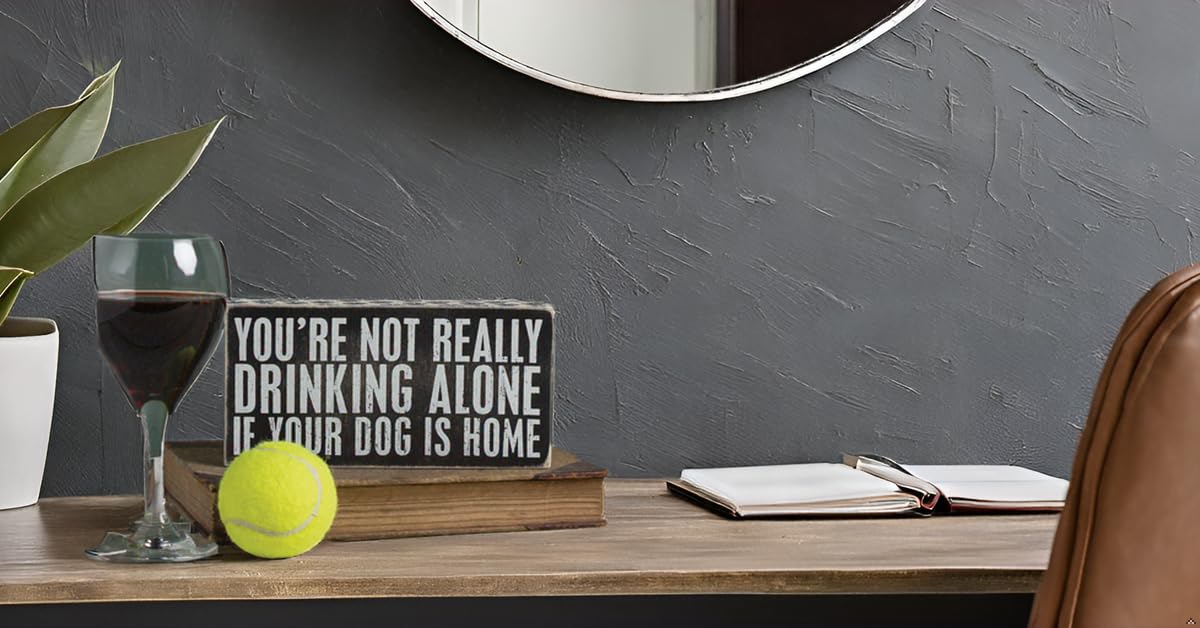 INSPIRATIONAL QUOTE - The sign reads 'You're not really drinking alone if your dog is home' serving as an inspirational desk decor that also adds a touch of humor to your home.