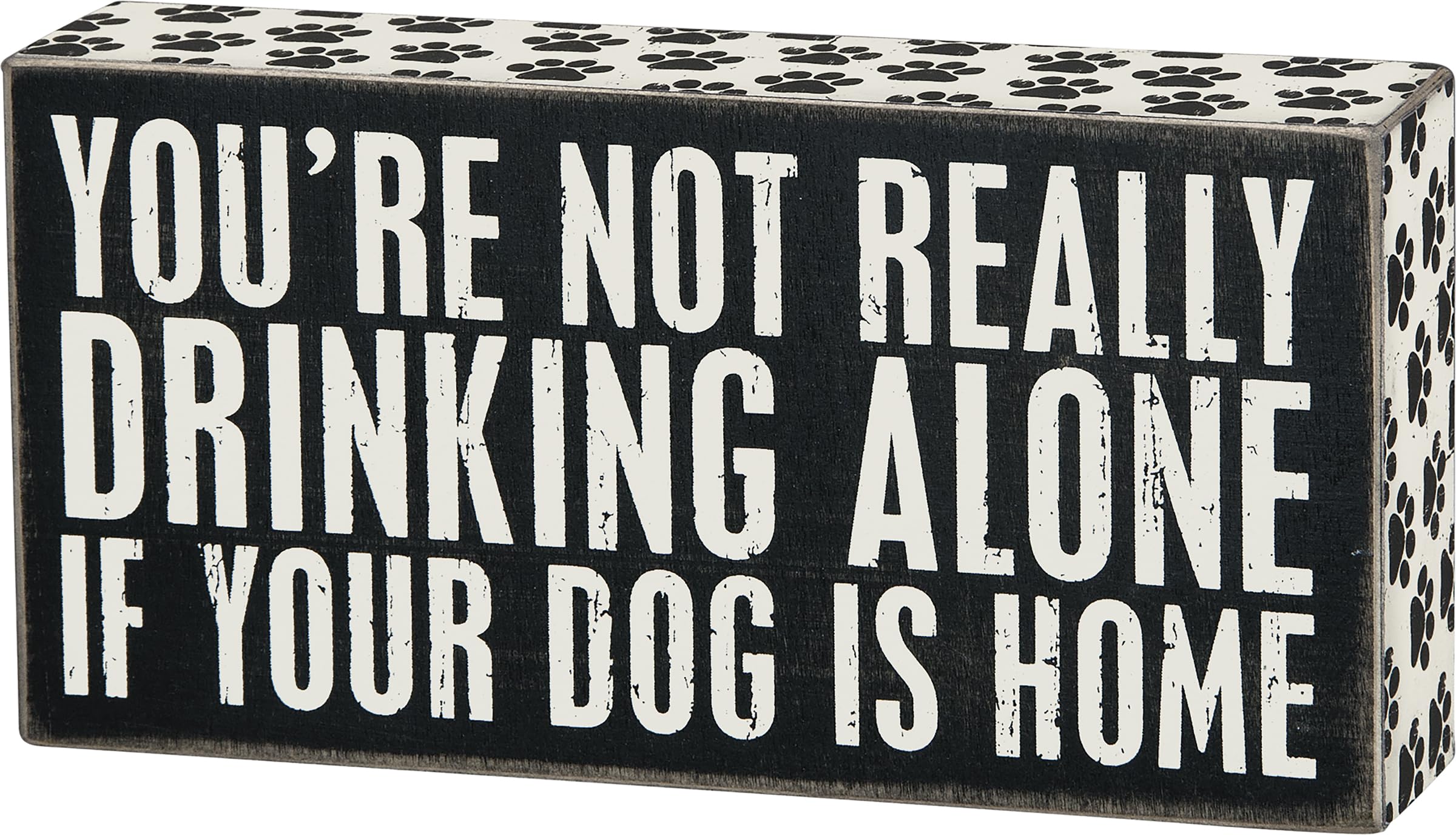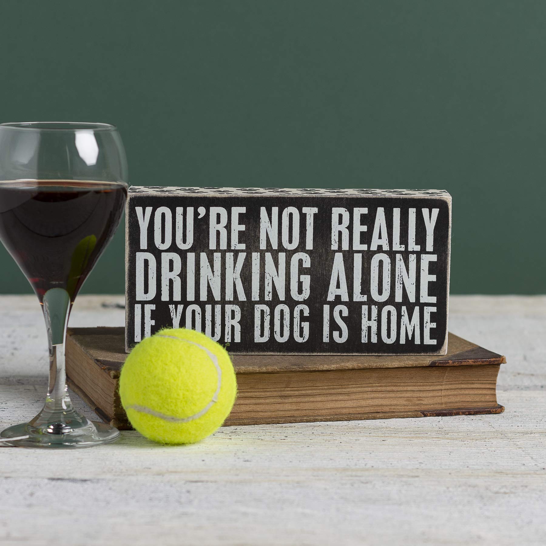 A classic black and white wooden box sign featuring a distressed "you're not really Drinking Alone if your dog is home" Sentiment with paw print patterned trim. Easy to hang or can free-stand alone. Measures 8 x 4-inches. stitching, and fabrics. In 1997, Kathy made her first "primitive candle box" By hand, taking care into each detail from the sanded edges to the type of ribbon tied on the wire handles, each was a work of passion. As Primitives by Kathy grows, the company works to give back, starting with an initial relationship with Goodwill Services and expanding into several more charitable causes held both by the company and those the company supports on behalf of their employees. They are constantly inspired by the people, places and things around us. Kathy travels the world to pull inspiration first hand from cultures around the globe. Look for all of Primitives by Kathy for inspirational, fun, sarcastic, and heart-warming gifts and home decor. You'll want to have one for yourself and another for someone you care about.