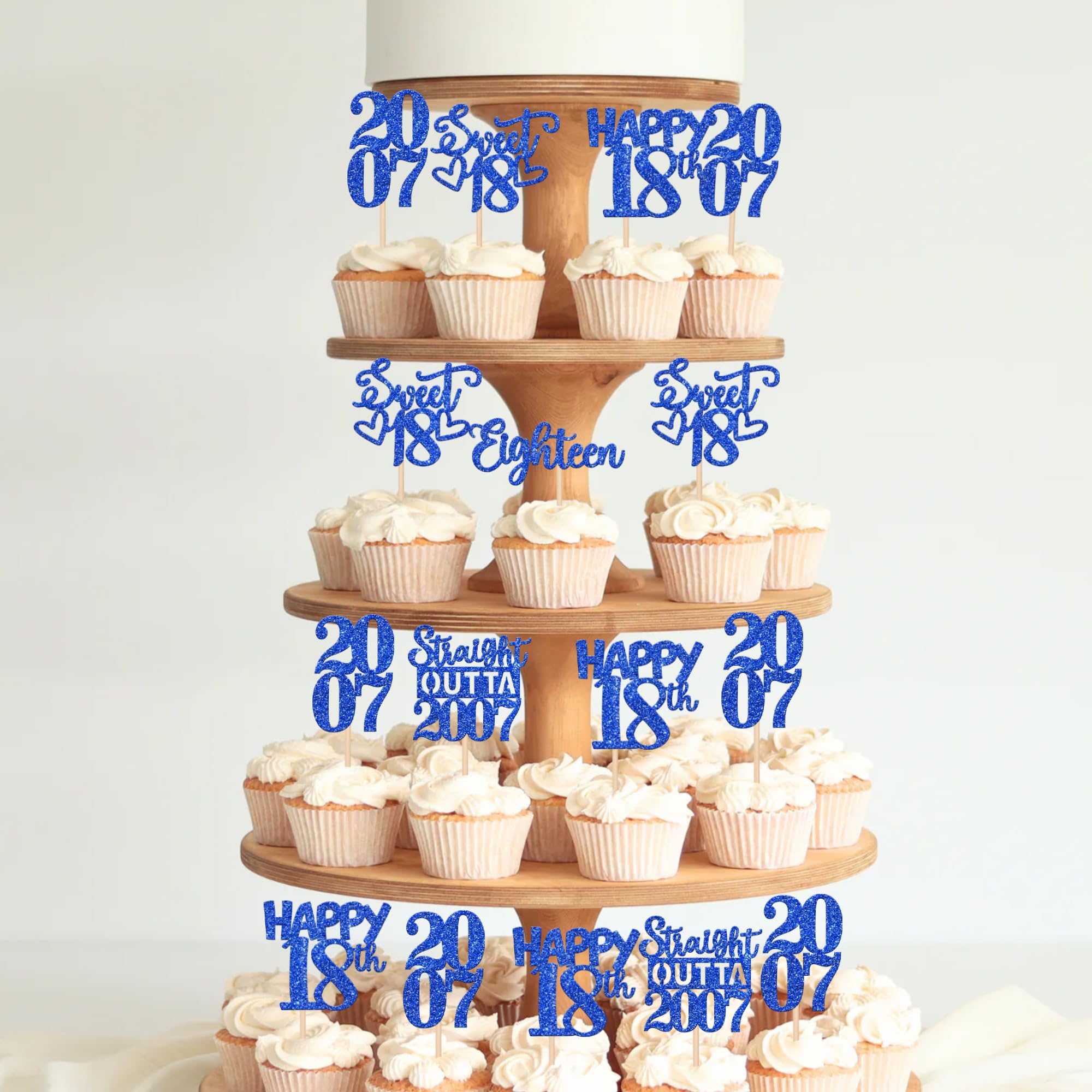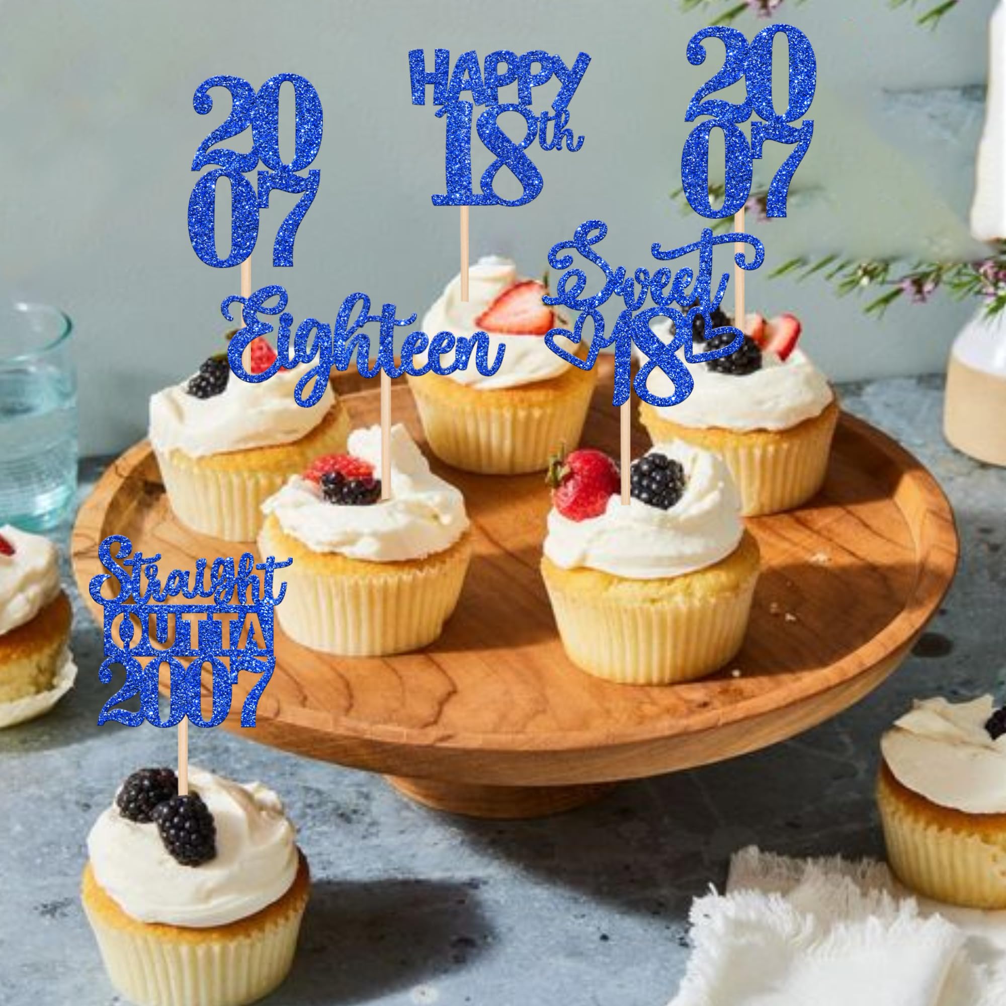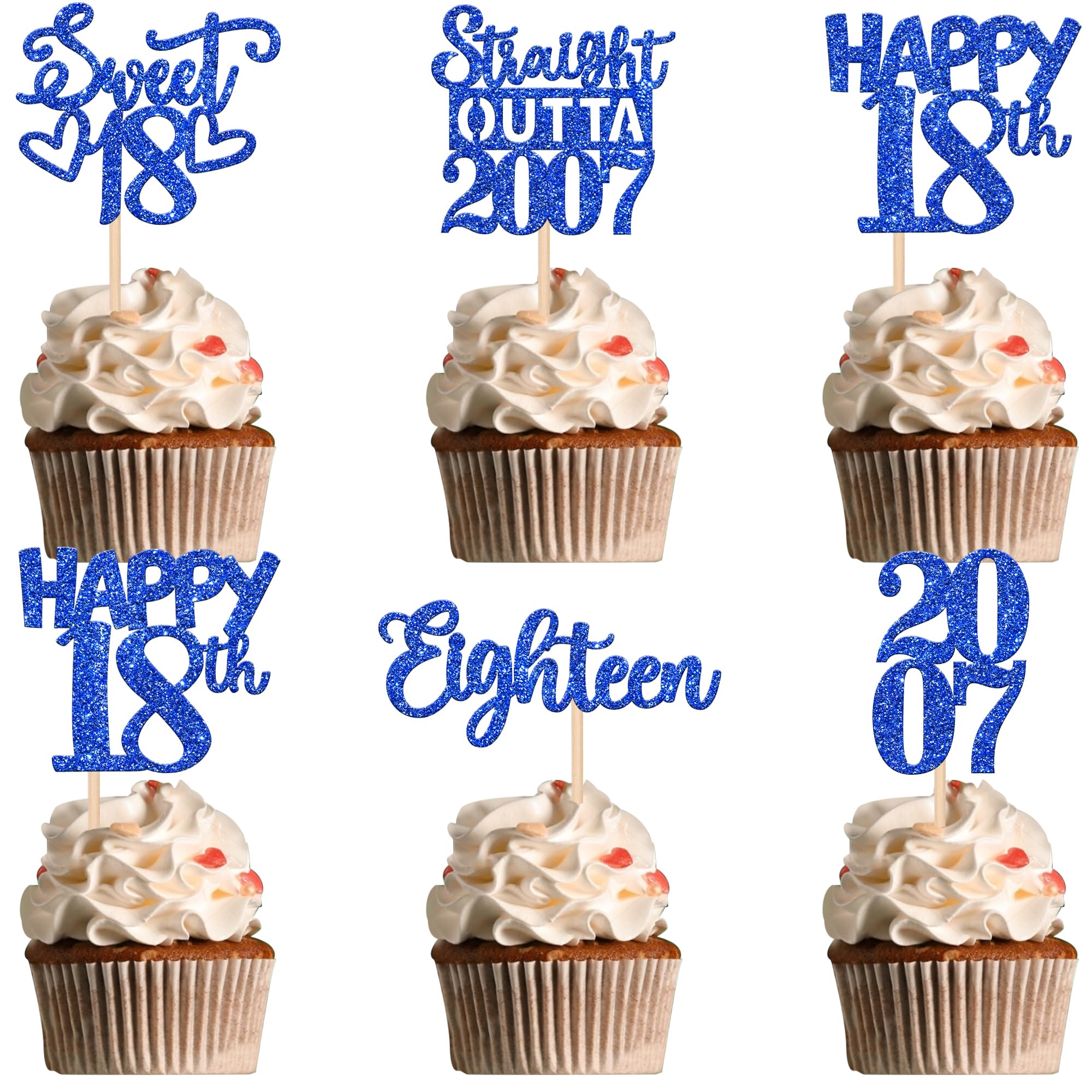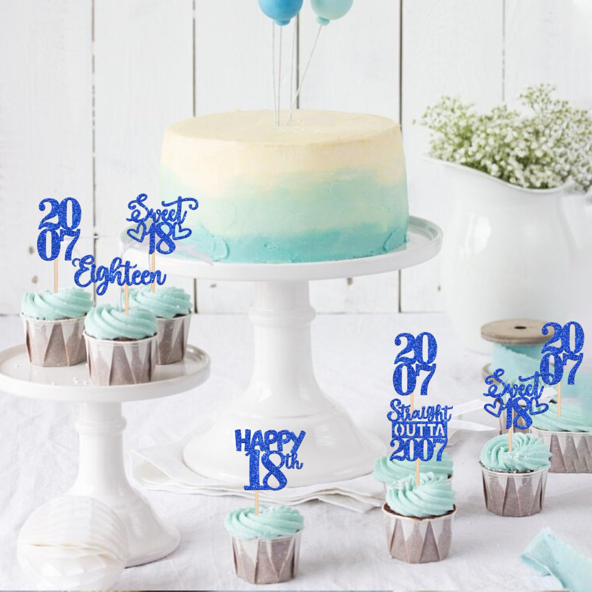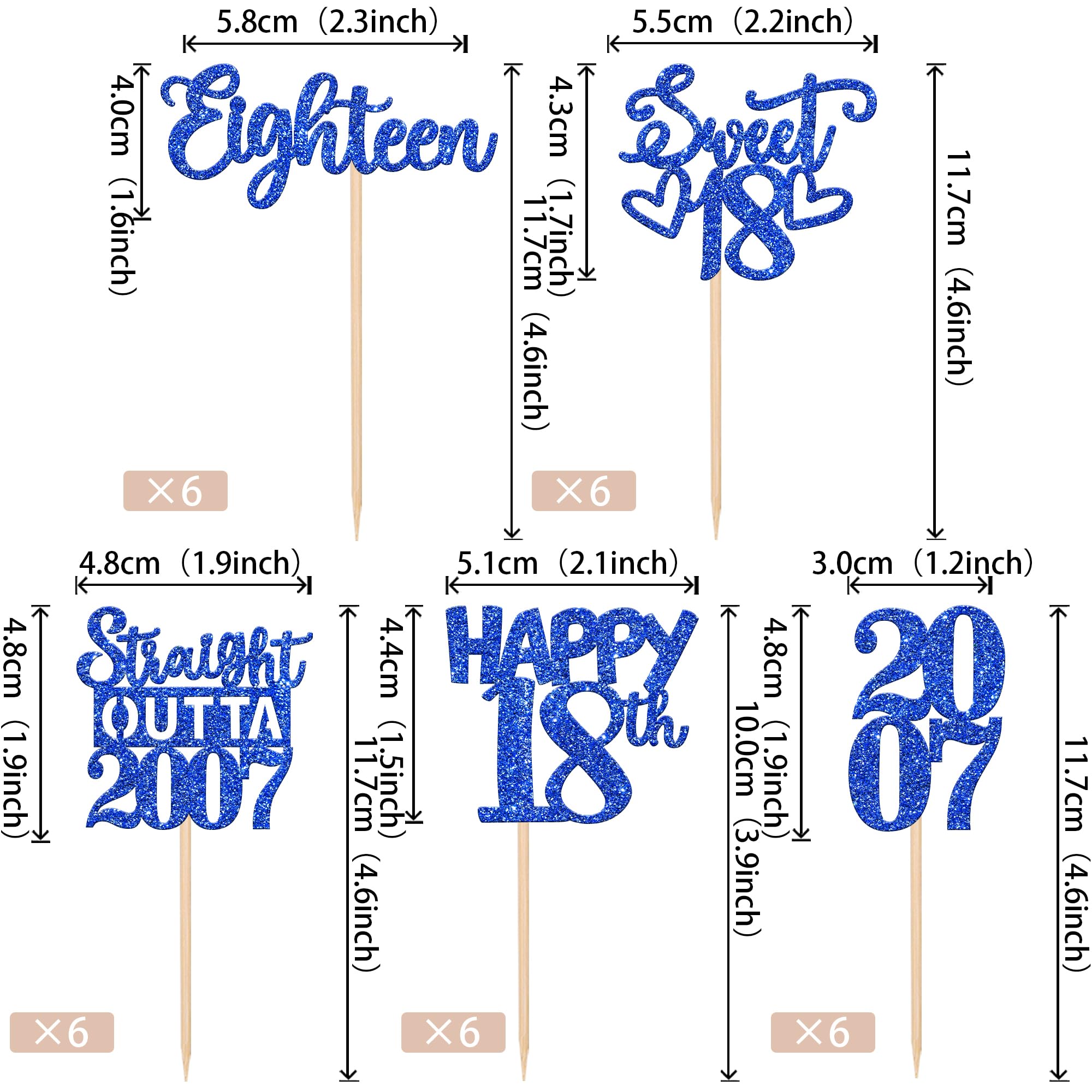 30 PCS 18th Birthday Cupcake Toppers Glitter Eighteen Happy 18th Straight Outta 2007 Cupcake Picks for Cheers to 18 Fabulous 18th Birthday Anniversary Party Cake Decorations Supplier Blue Perfect for happy 18th bithday theme party, straight outta 2007 theme party, 18th wedding anniversary theme party,cheers to 18 years theme party cupcake decorations supplies. Pack of 30 pcs, 6 pcs of each design. The size is 1.9*4.6 inch / 1.3*3.9 inch / 2.1*4.6 inch / 2.9*3.9 inch / 2.2*4.5 inch ( with stick ) Made of high quality paper card stock,thick and sturdy. These straight outta 2007 cupcake toppers are one side glitter, another side is white, and they are intended for decoration only, please do not put them in oven or microwave. If the item you received has any defects, please contact us immediately. we will deal with it within 24 hours.