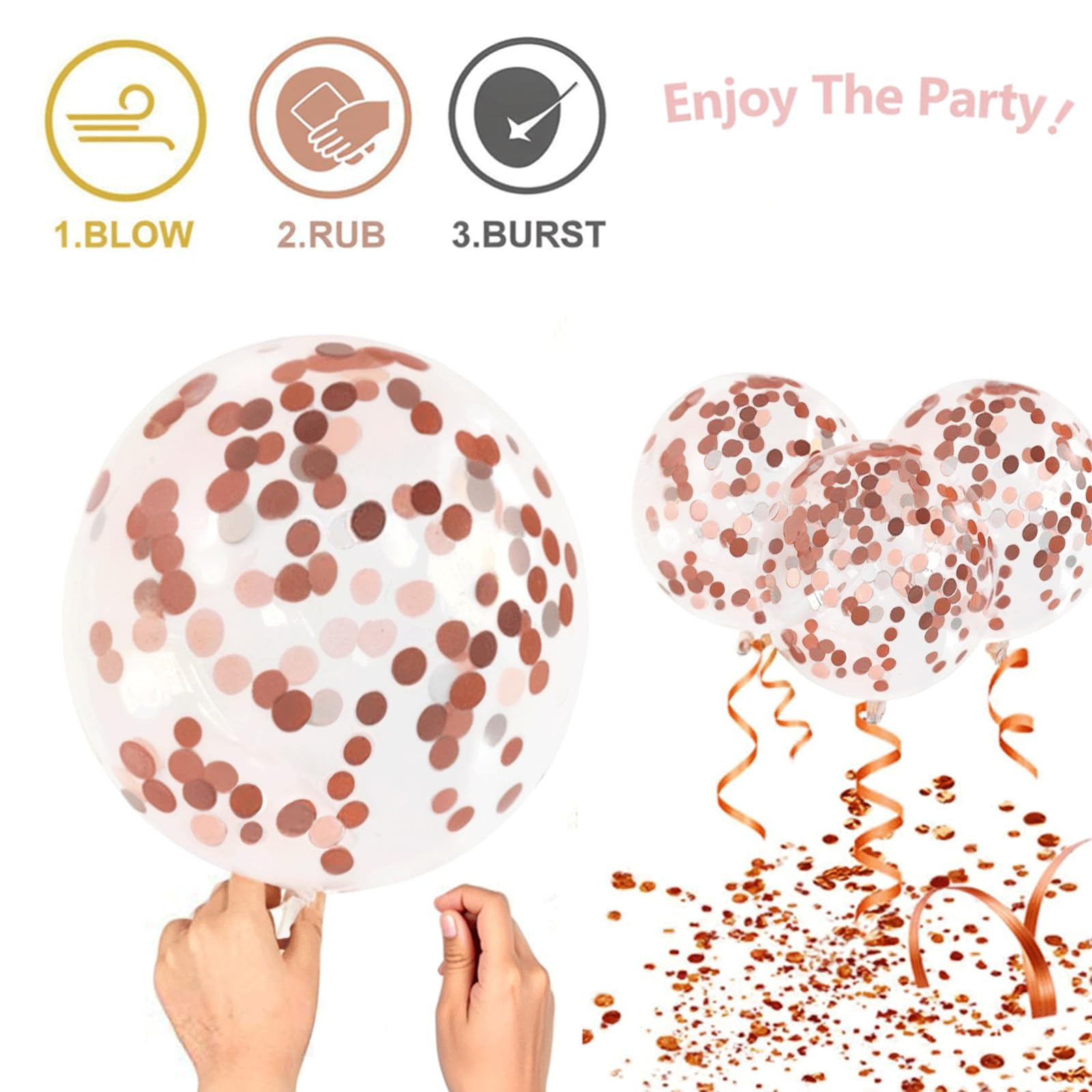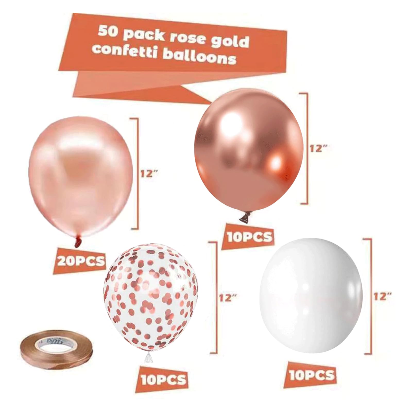 【Rose Gold Balloons 】- This rose gold confetti balloons set come with : 20 pcs rose gold latex balloons, 10pcs rose gold confetti balloons, 10pcs rose gold metallic chrome balloons,10pcs white latex balloons, one rose gold ribbon (33 feet total). Offering you a good choice for making nice indoor or outdoor decoration, to create more joyful time for families and friends.