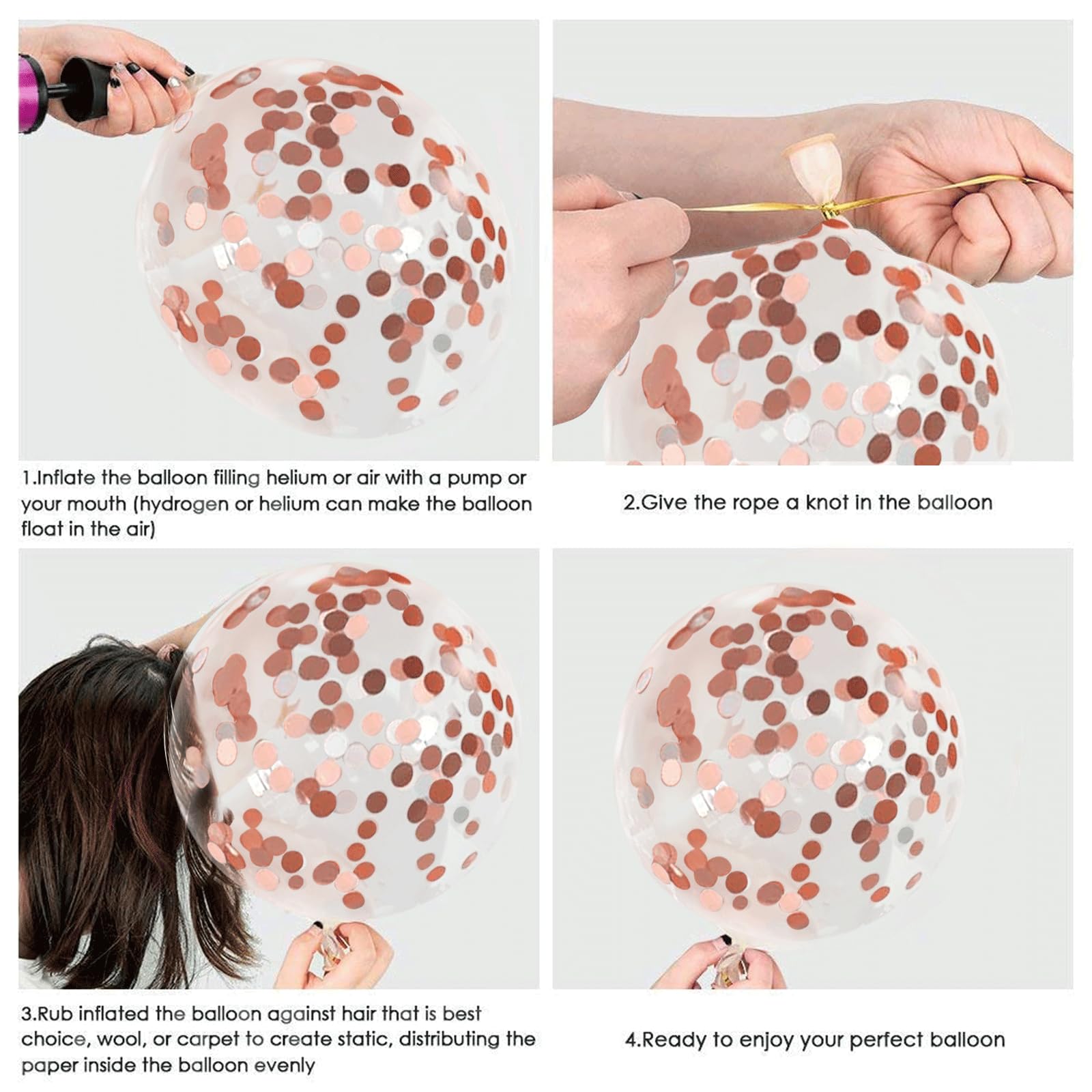 【 Confetti Balloon】- Due to the rose gold confetti is heavier than helium, the confetti moves in the direction of gravity. Rubbing the outer side of the balloon on the hair (the best way )or silk, wool, will help the confetti stick to the balloon. A balloon pump is strongly recommended. This will make the balloons look more beautiful.