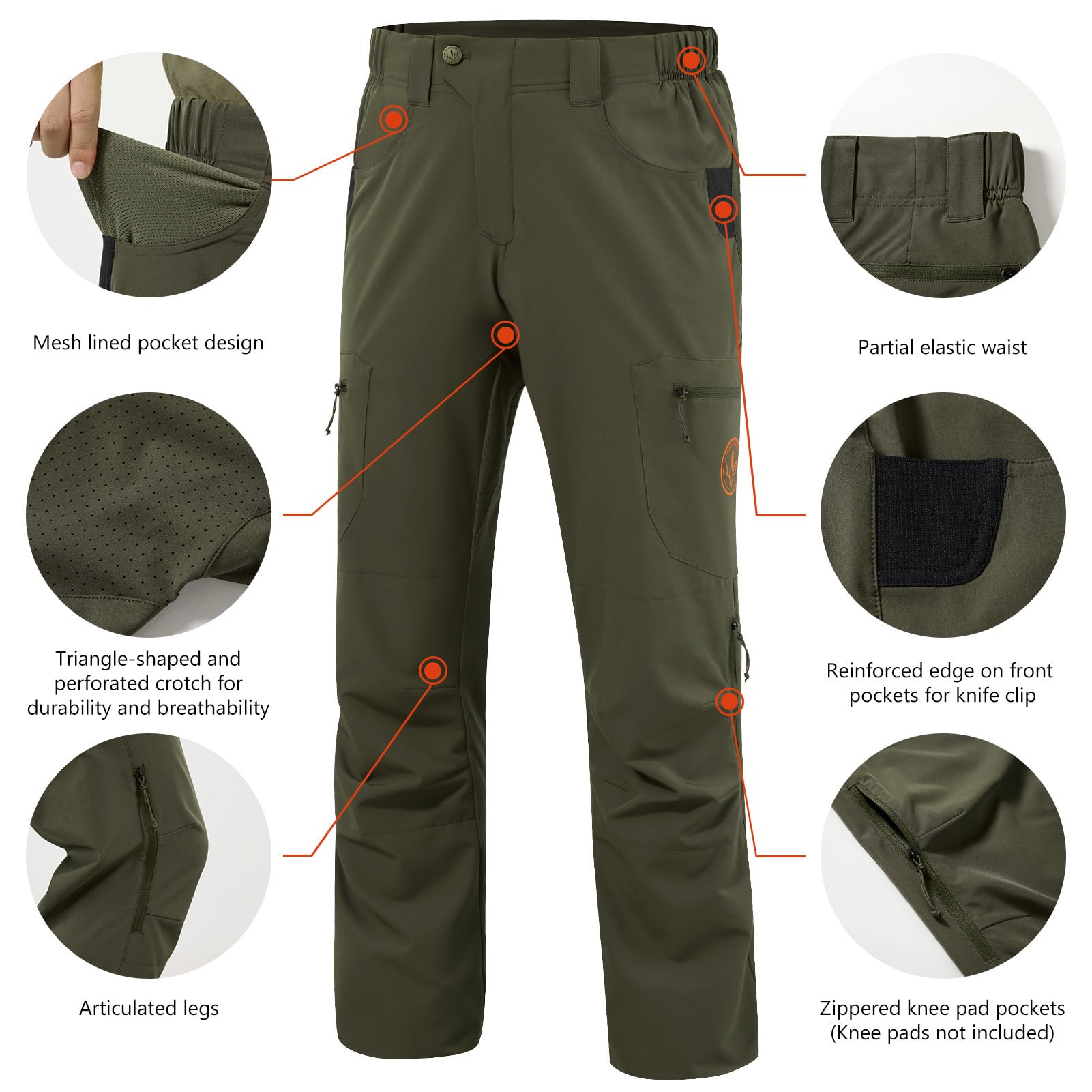 Other features include partial elastic waist with button and zipper closure, reinforced edge on front pockets for knife clip, articulated legs and triangle-shaped crotch gusset to improve durable comfort wear and full range of motion