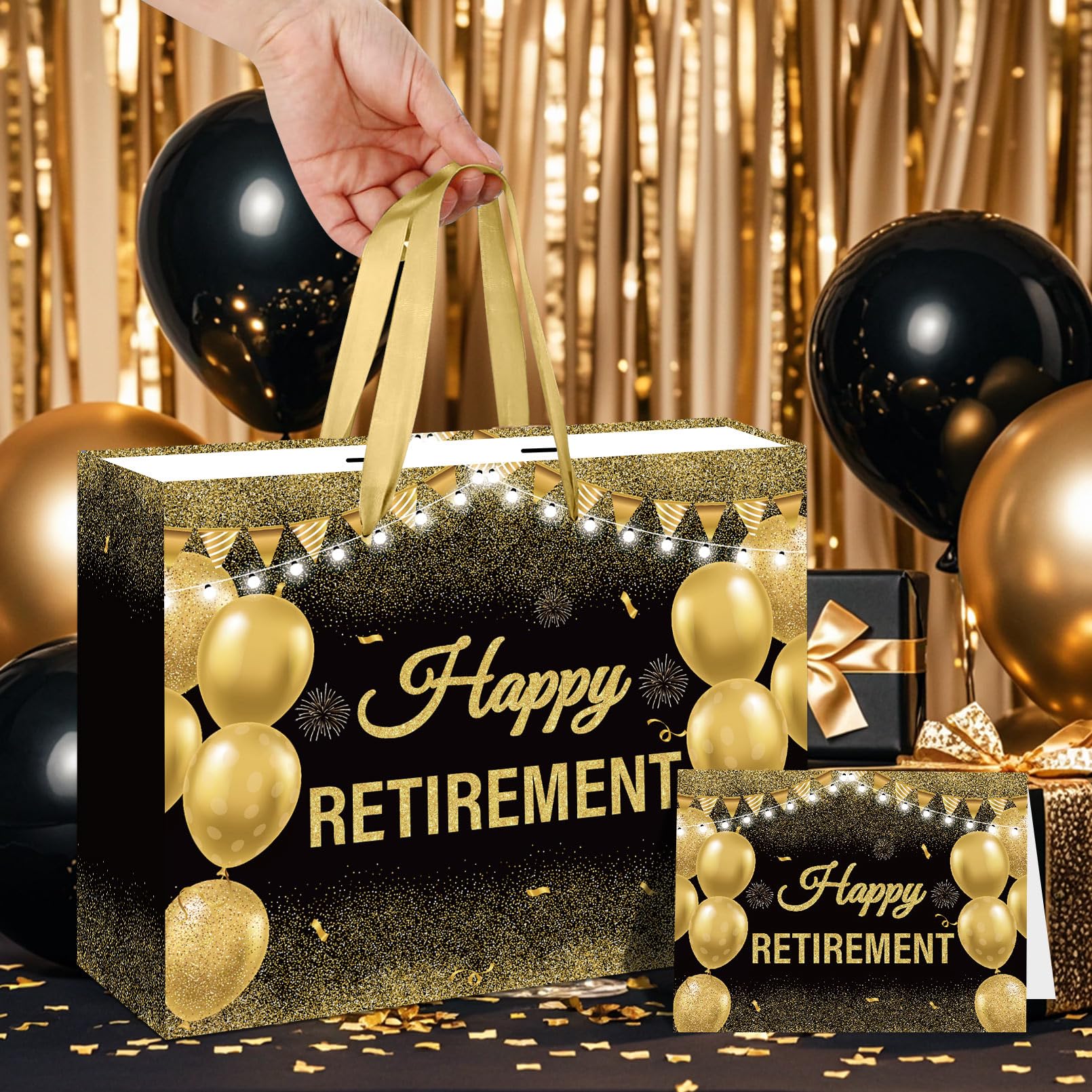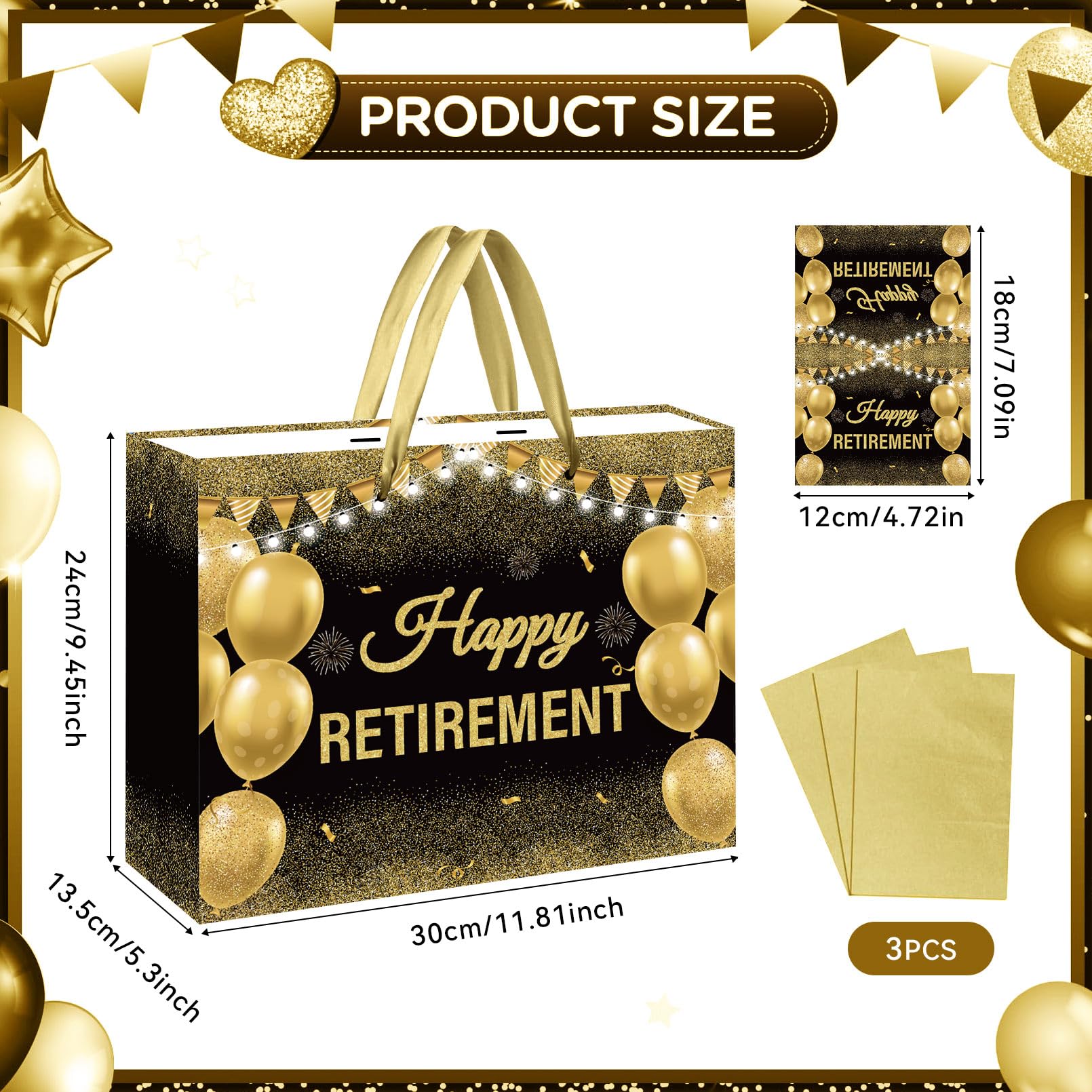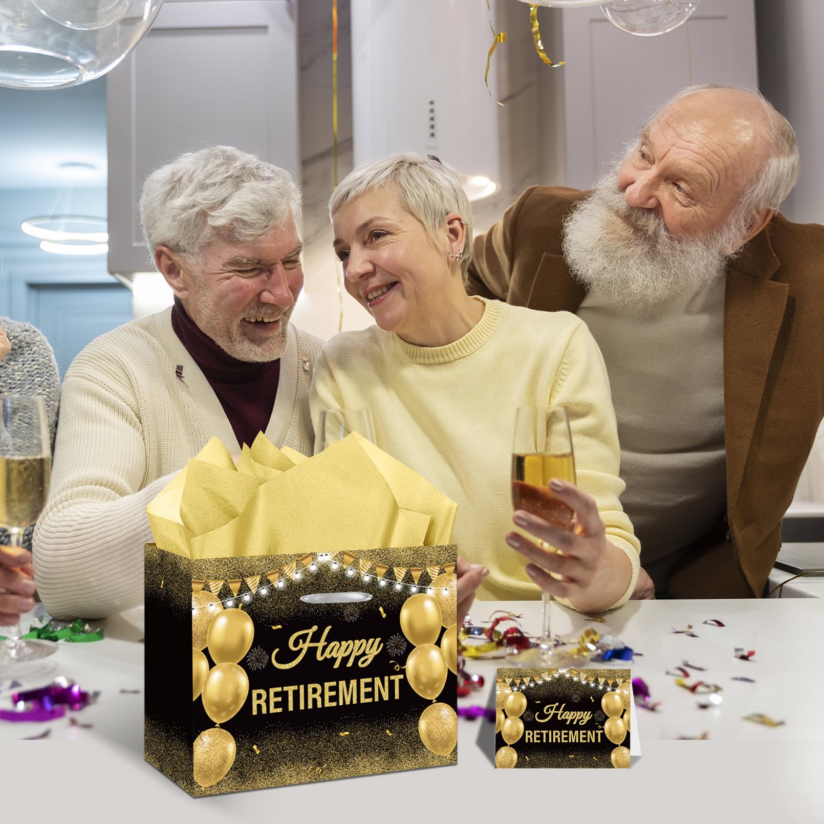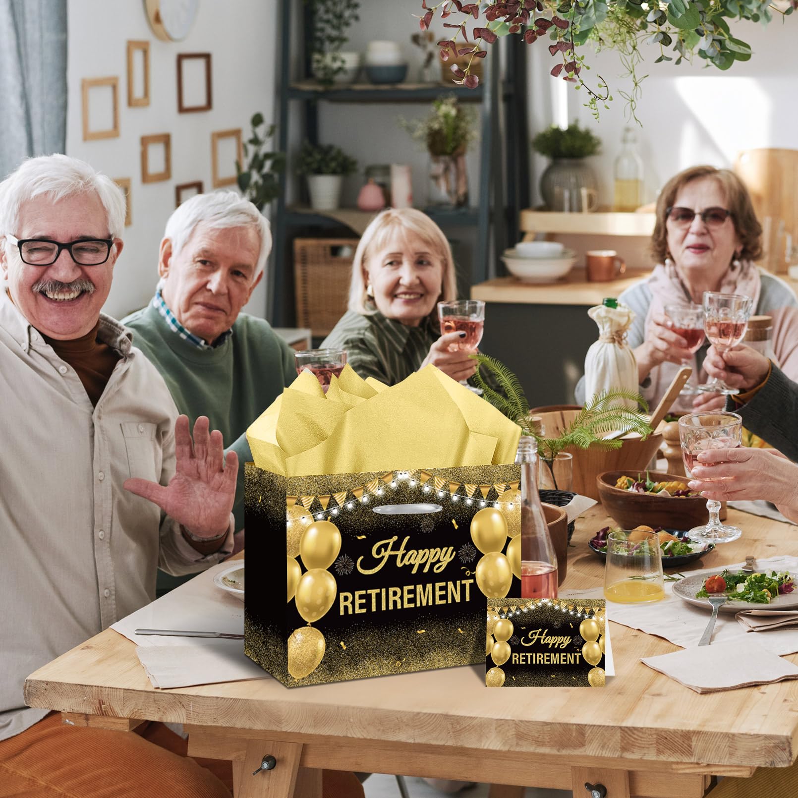 Retirement Gift Bag with Tissue Paper Set Large Black Gold Happy Retirement Wrapping Gift Bag and Greeting Card and envelope for Men Women Office Coworker Farewell Going Away Party Favors Wrap Bags Supplies