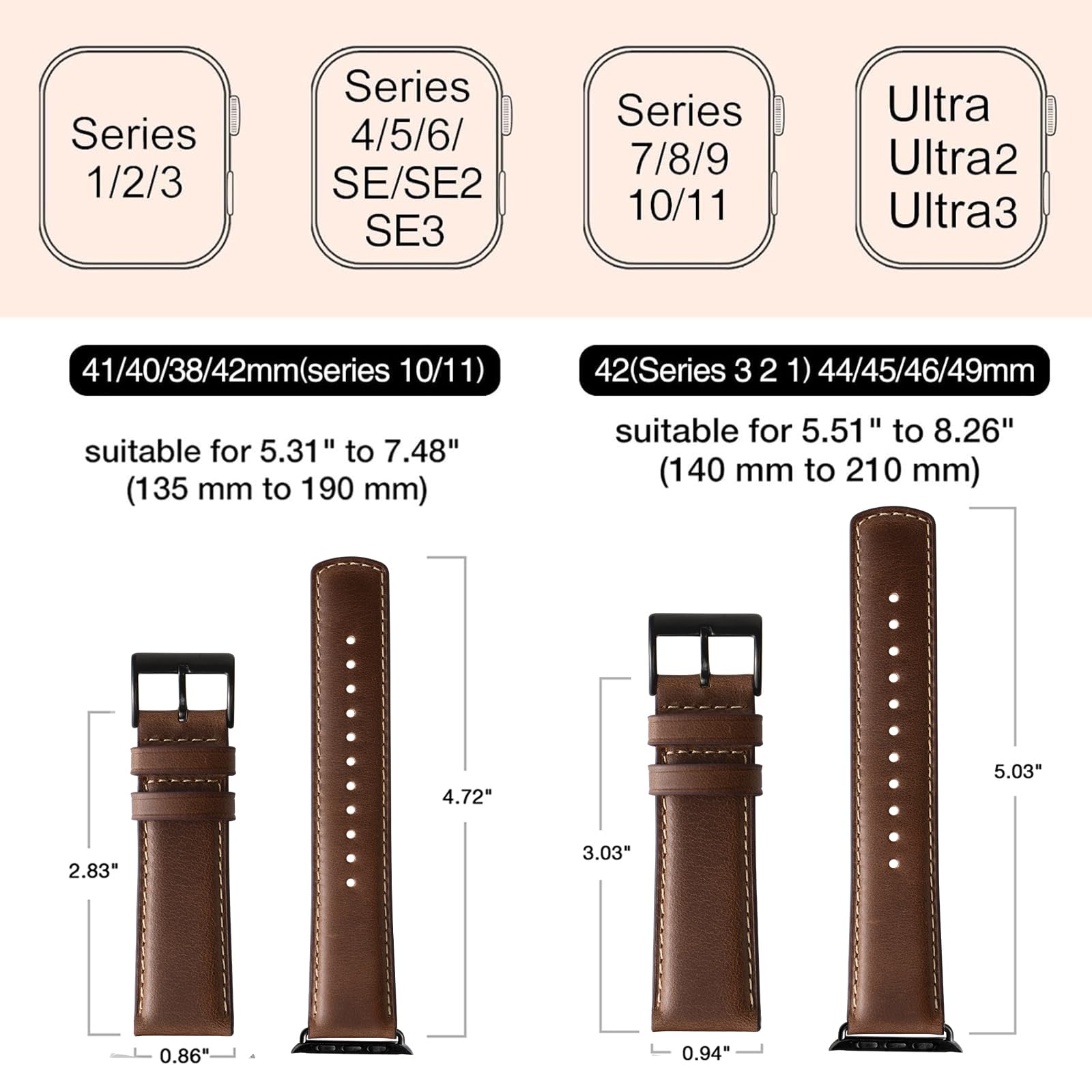 Perfect Compatibility: Our band is designed to fit Apple Watch models 41mm 40mm 38mm 42mm(series 10 11) and is compatible with SE3, SE2, SE, Series 11 10 9 8 7 6 5 4 3 2 1. The wrist strap for wrists from 5.31" to 7.48" (135 mm to 190 mm), ensuring a perfect fit for both small and large wrists