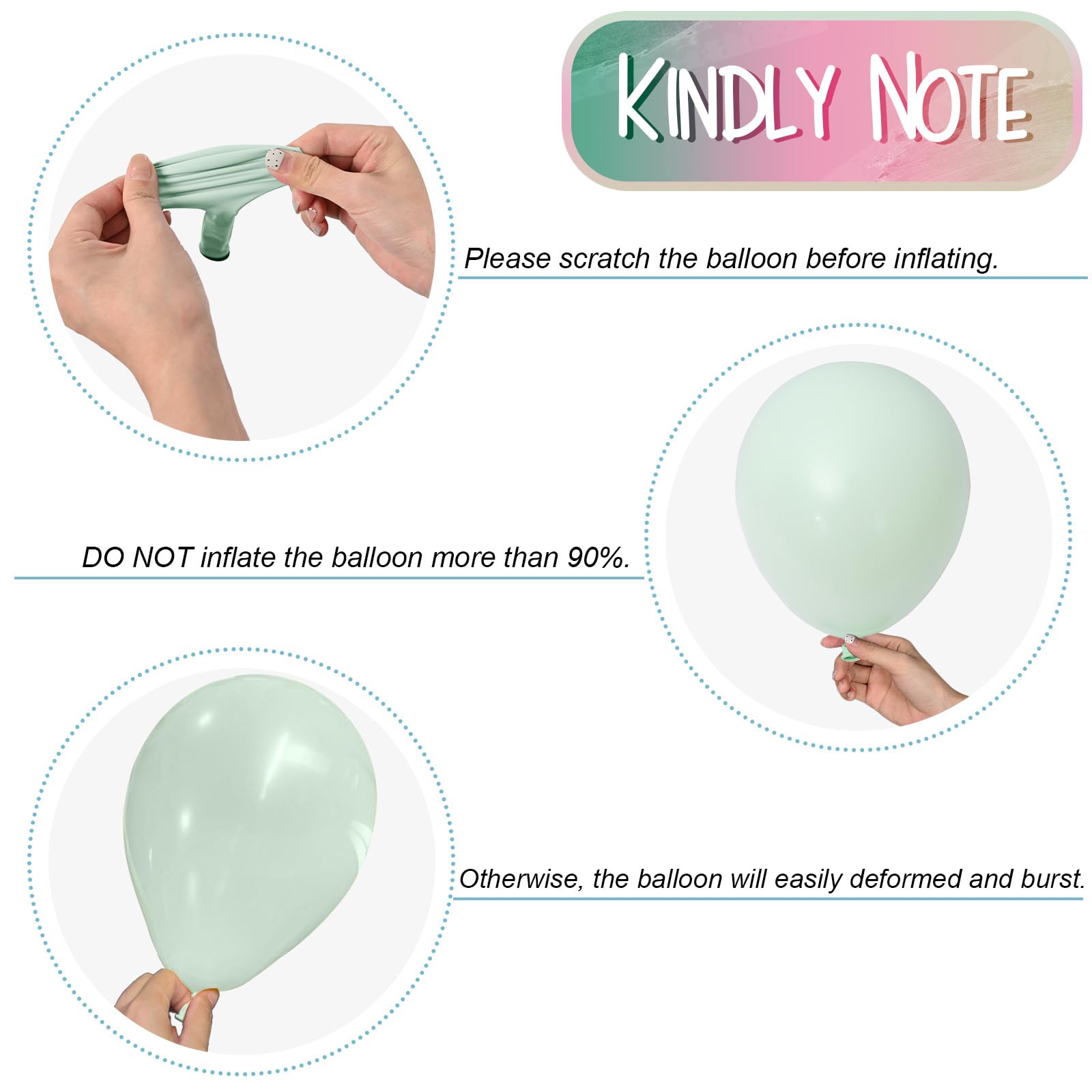 Kindly Note - Balloons may have color differences under different lighting and screen conditions. Please scratch the balloon before inflating. DO NOT inflate the balloon more than 85%. Otherwise, the balloon will easily deformed and burst. The tail must be pulled tight after the balloon is knotted. Avoid the balloon contact with high temperature, avoid using pointed objects to stab the balloon. Have a great DIY balloon party!