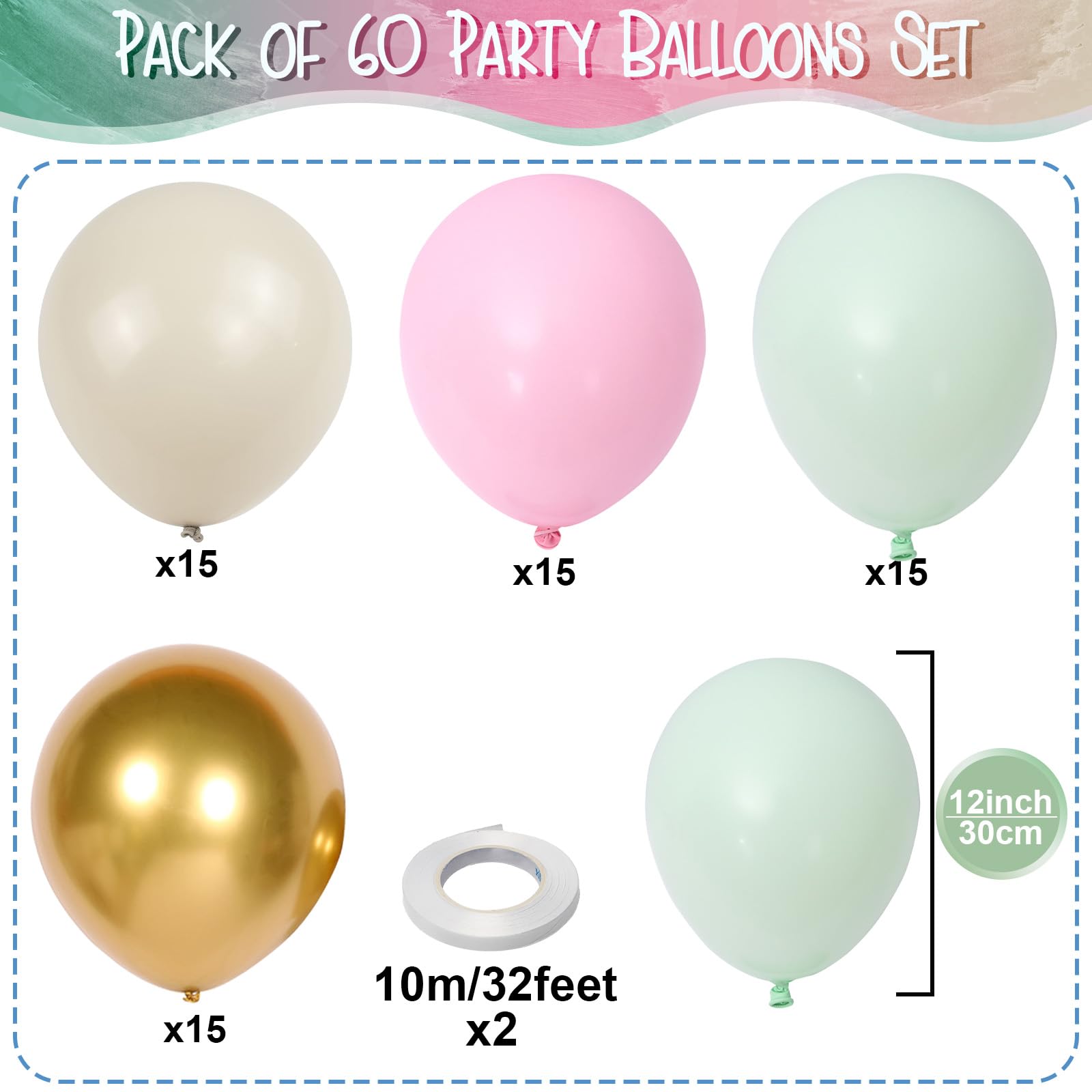 Package Includes – You will receive 60 pieces of 12-inch balloons: 15pcs sand white, 15pcs pastel green, 15pcs pastel pink, and 15pcs metallic gold. To make decorating easy, you’ll also receive 2 rolls of 10-meter white ribbon. Whether you’re setting up a Nutcracker Christmas party, creating a birthday arch, or decorating a dessert table, this kit provides all the essentials to design balloon bouquets, garlands, or backdrops.