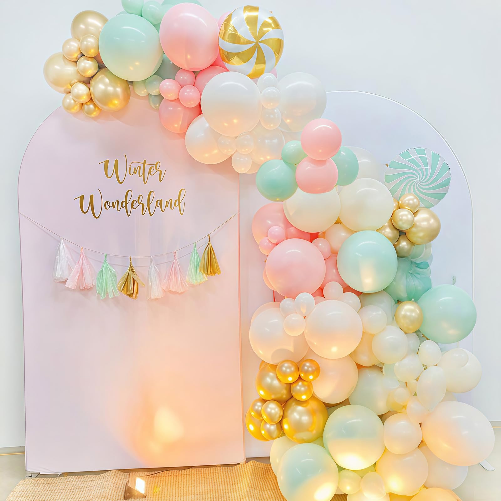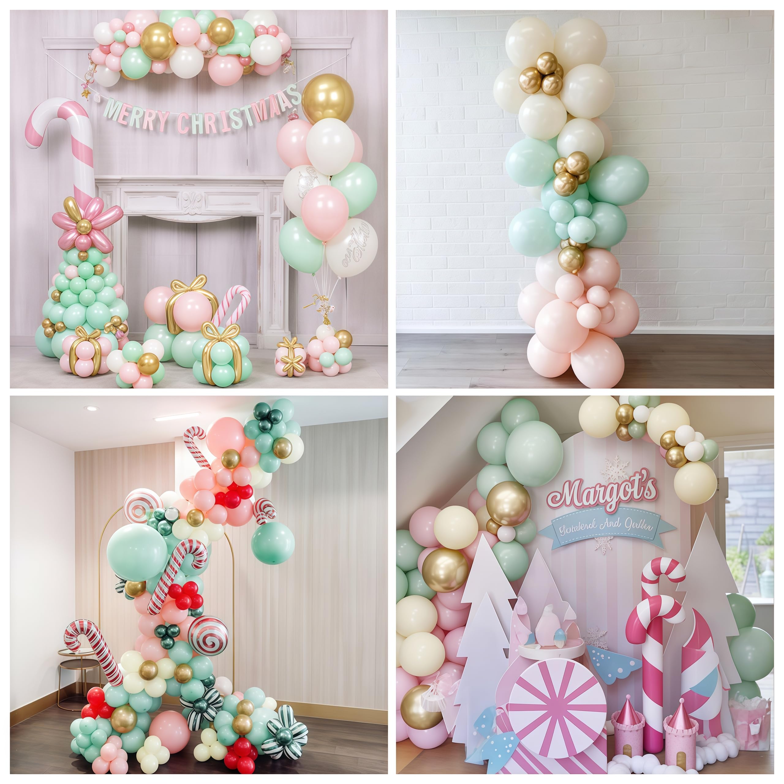 Chic Pastel Balloon Theme – This balloon set combines sand white, macaron green, macaron pink, and metallic gold to create a stylish pastel palette with a festive twist. The soft colors with gold accents bring elegance and playfulness, perfect for birthdays, weddings, baby showers, bridal showers, or seasonal holiday parties. It also pairs beautifully with Nut-inspired Christmas cracker décor for a whimsical and charming atmosphere.