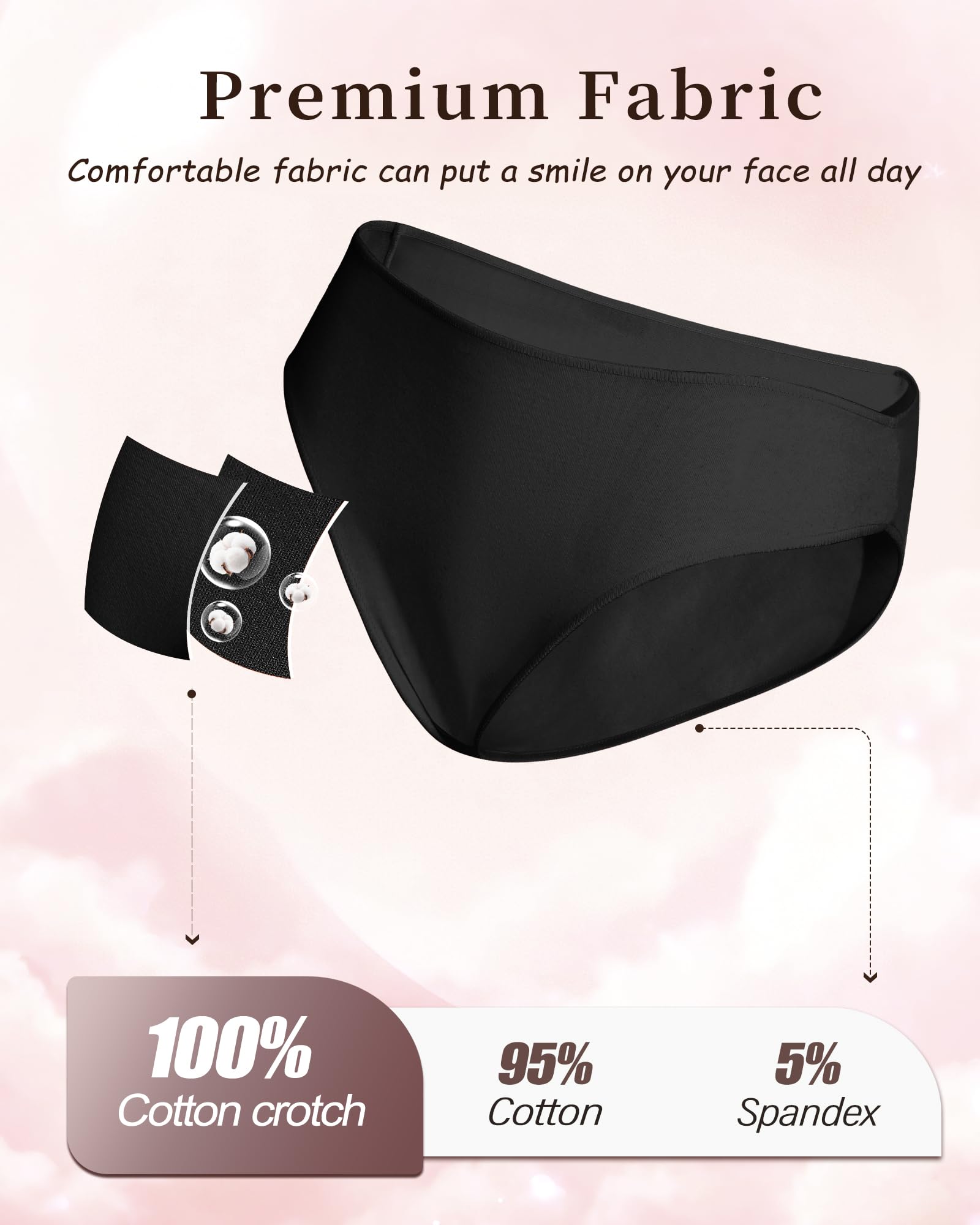Cotton Underwear For Women: Womens underwear is made of 95% combed cotton, 5% spandex. The blend of PREMIUM combed cotton and spandex makes these underwear soft, stretchy, breathable, and gentle on sensitive skin for comfortable wear.