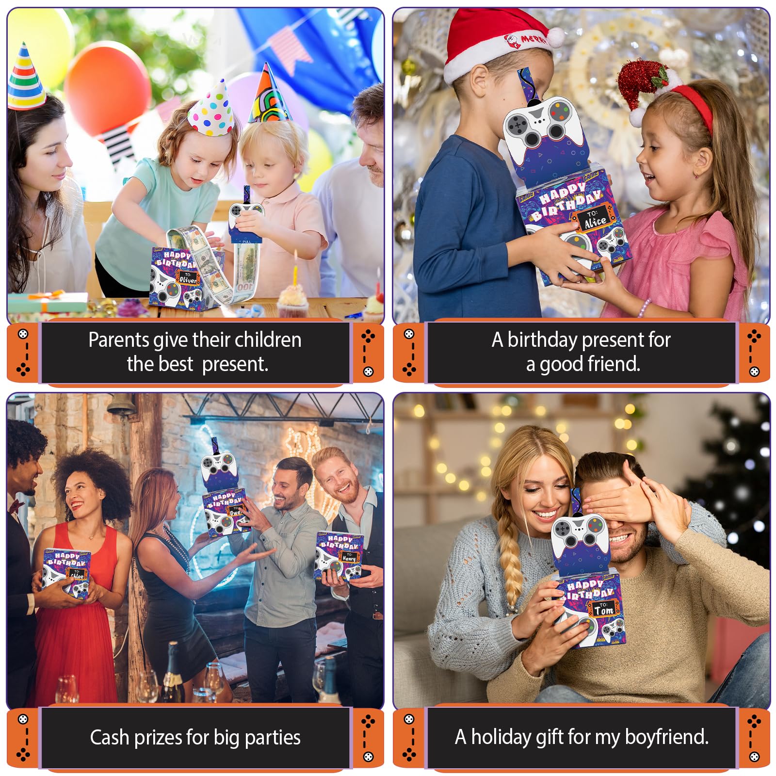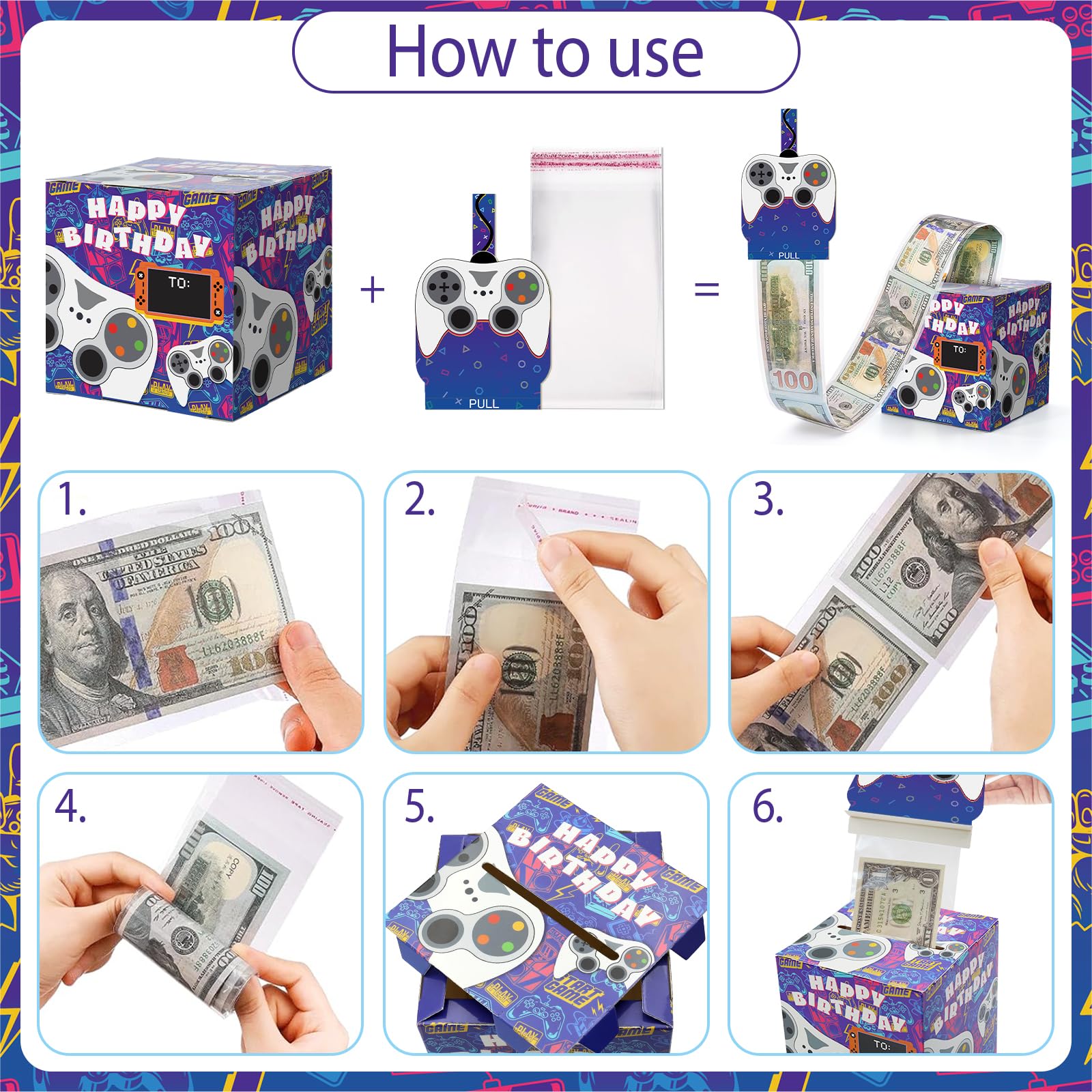 【Easy to Assemble 】1 Put the money in the transparent bag. 2 There is tape on the clear bag, just one pull and they stick together. 3 Roll up the money, put it in the box, use a tape to stick the game console-shaped puller card together on the box and pull it out