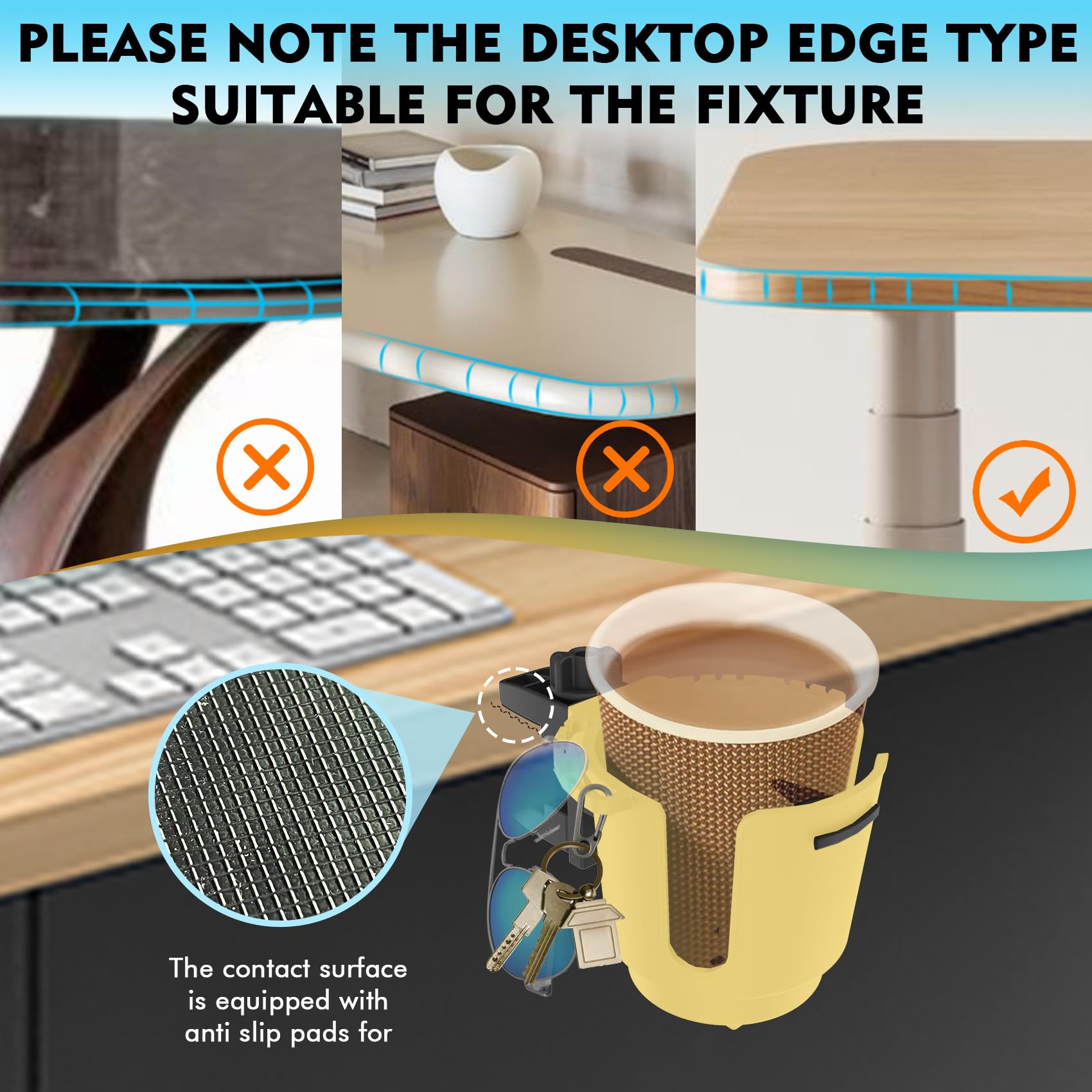Multifunctional design: Our drink holder is designed for convenience. It has a U-shaped groove extending from the edge to accommodate glasses, office pens, etc. There is also a silicone anti-slip flap inside the cup holder to protect your water cup to the greatest extent. .