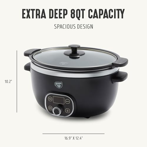 The GreenLife 8QT Slow Cooker makes it easy to create delicious meals for the whole family. The extra deep pot is perfect for big-batch soups, hearty stews, game-day chili, and crowd-pleasing mains — all with plenty to share. The removable pot is stovetop and oven safe, so you can sear, sauté, or brown your ingredients before slow cooking them to tender perfection. GreenLife’s signature healthy ceramic nonstick coating makes cleanup effortless and is PFAS-free for healthier meals every day. The simple control dial offers Low, High, and Warm settings to match your recipe and schedule, while the clear glass lid lets you check on your meal without losing heat. When it’s time to serve, switch to Warm to keep your food fresh and ready. And when the feast is over, both the pot and lid are dishwasher safe for an easy cleanup.