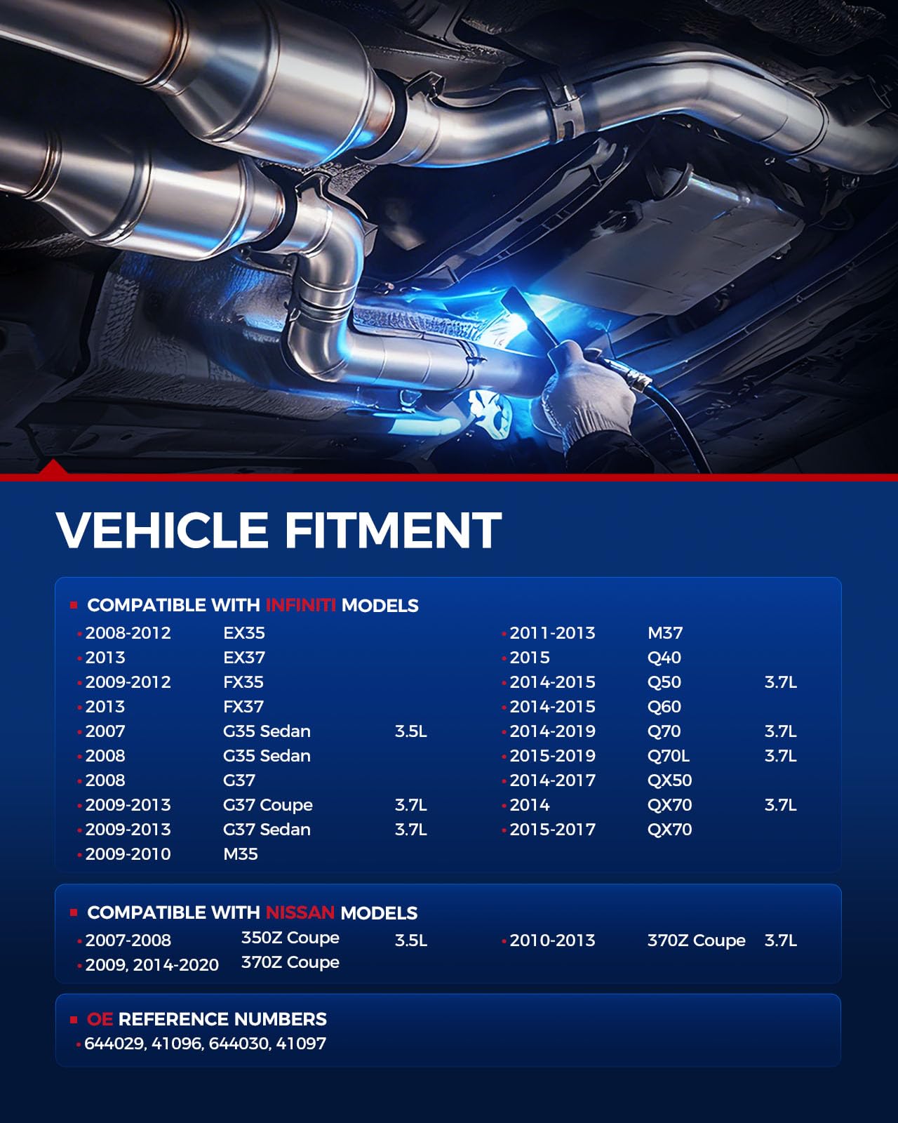 Fitment: KAX Catalytic Converter Fit for QX70 2014-2017,QX50 2014-2017,Q50 2014-2015,M37 2011-2013,M35 2006-2010,G37 2008-2013,G35 2003-2008,FX35 2003-2012,370Z 2009-2020,350Z 2003-2009.Please confirm the matching in "confirmed it" to confirm whether the parts are suitable for your vehicle application.OE Number:644029 644030
