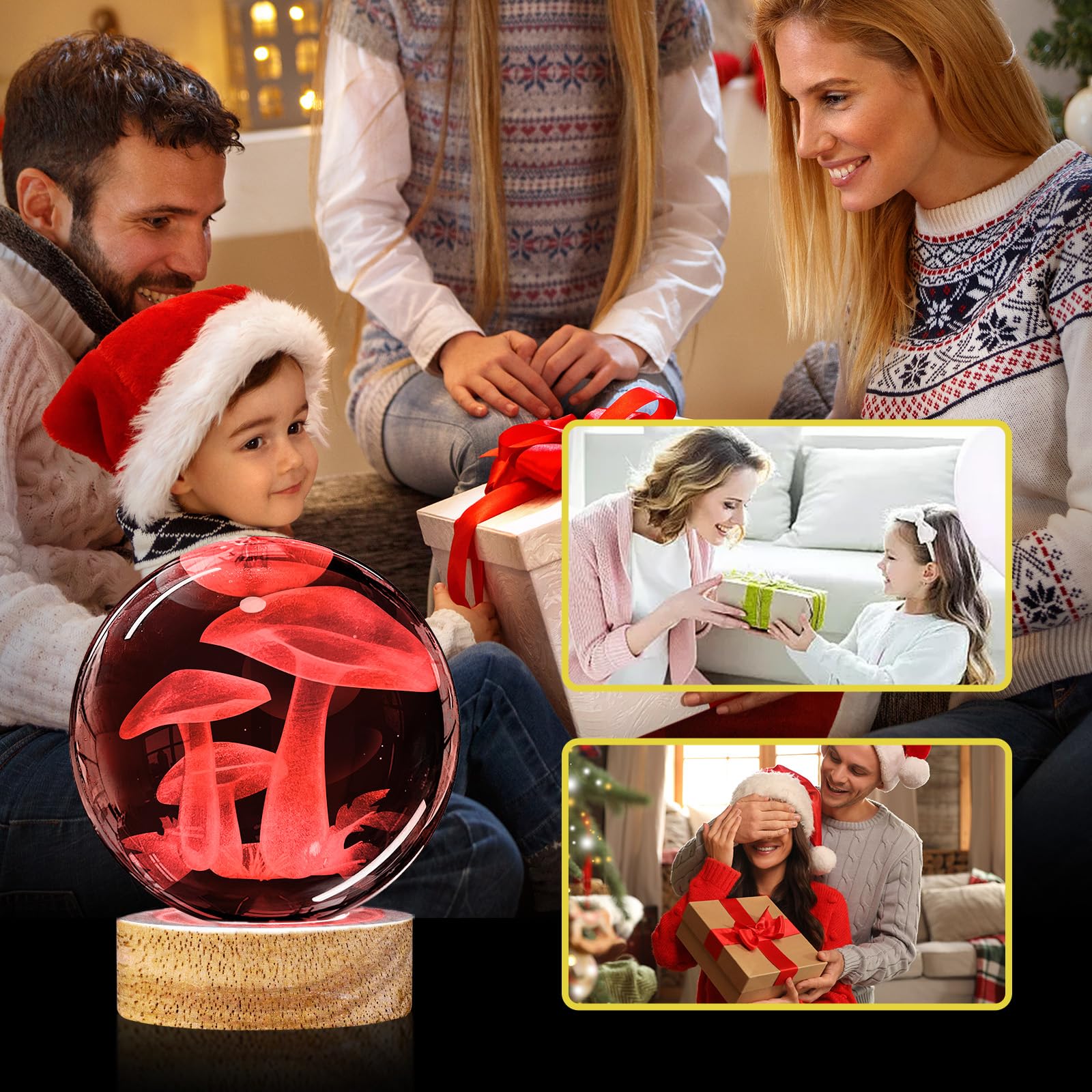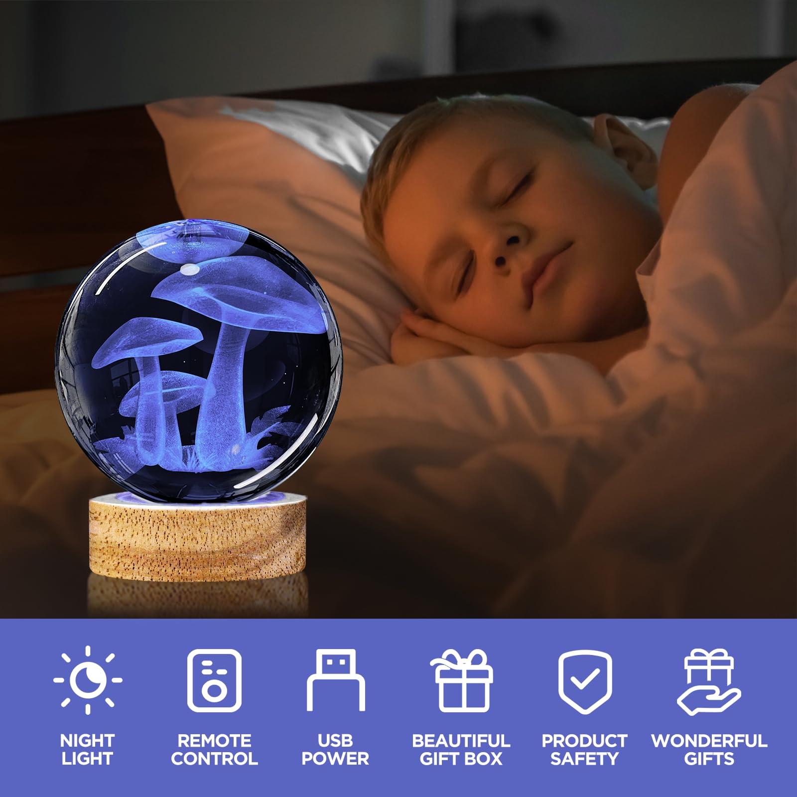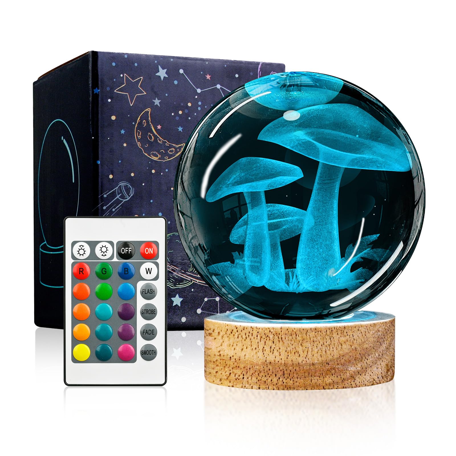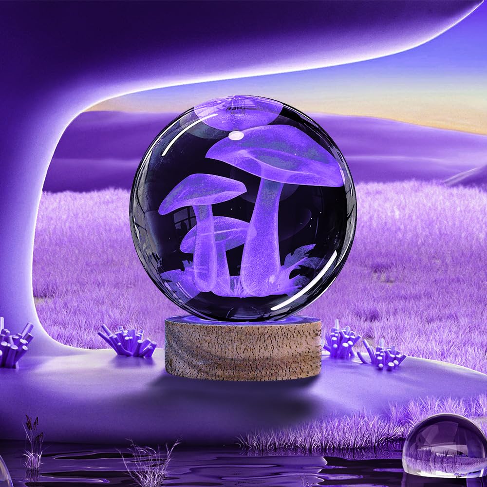 👍3D Mushroom Crystal Ball Night Light Lamp with 16 Colors Light, Best Gift for Birthday Christmas, Home Office Decor 💡Specification: Material: High-Quality K9 Crystal Base Material: Eco-Friendly Beech Wood Crystal Size:80*80*80mm (3.15*3.15*3.15 inch) Crystal Weight:0.65kg (1.43 Lbs) Light Color: 16 Colors+4 Modes 💡What You Get: 1 x Crystal Ball 1 x Wooden base 1 x USB charging cable 1 x Remote Control 1 x Microfibre Cleaning Cloth 1 x Exquisite gift box 💡What Makes Our 3D Mushroom Lamp Special? 1. Made with k9 highest-quality crystal, making the crystal ball more transparent and glossier. 2. Larger size than other commercially available crystal balls, the diameter of the crystal ball is 3.15 inches(8cm) 3. The 3D laser engraved pattern are stereoscopic, without breaking the surface of crystal, all patterns are clear and distinct. 4. 3D Mushroom night light crystal lamp comes with wooden base with usb cable line(no adapter),connect to such as computers, portable charger,output charger/adapter,etc.) 🎁Perfect Gift Pretty unique cool gift for kids, friends and fans - Creative and amazing night light unlike anything you've ever had, perfect for gift giving, especially for kids birthday gift, Christmas gifts, festival gifts or best friend's gift. After Sale Service All 3D Mushroom Crystal Ball lamp are carefully checked before sale. We strive to offer our customer the best product and service. Any problem please feel free to contact us for after sale service.