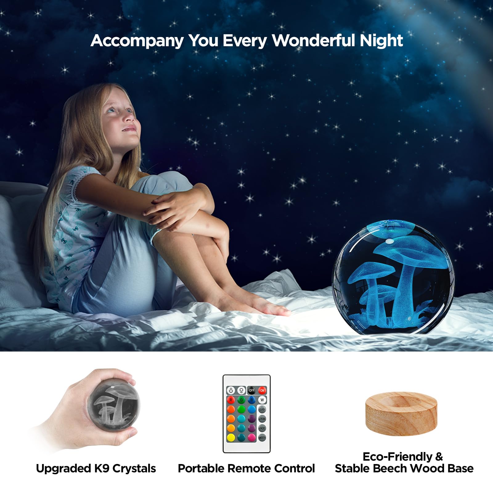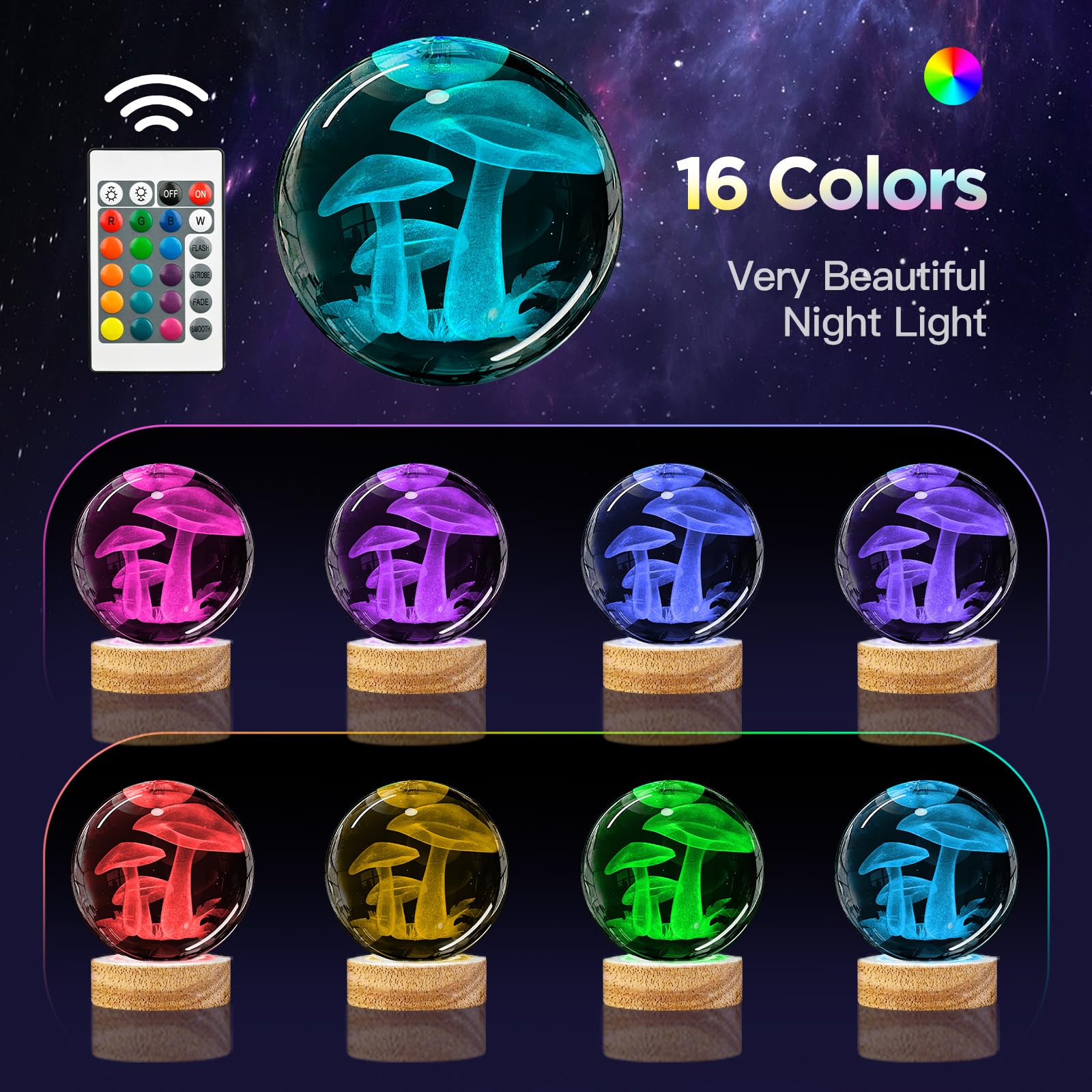 🔮【Magical 16 Color Changes】Our 3D Mushroom Crystal Ball Lamp have 16 colors and 4 modes. You can use the remote control to choose the color of your favorite lights and adjust the intensity of the lights. Flash, strobe, fade and smooth 4 modes, can also always light a color, soft and not glare, protect your eyes. (Please note: Needs to be powered up via USB).