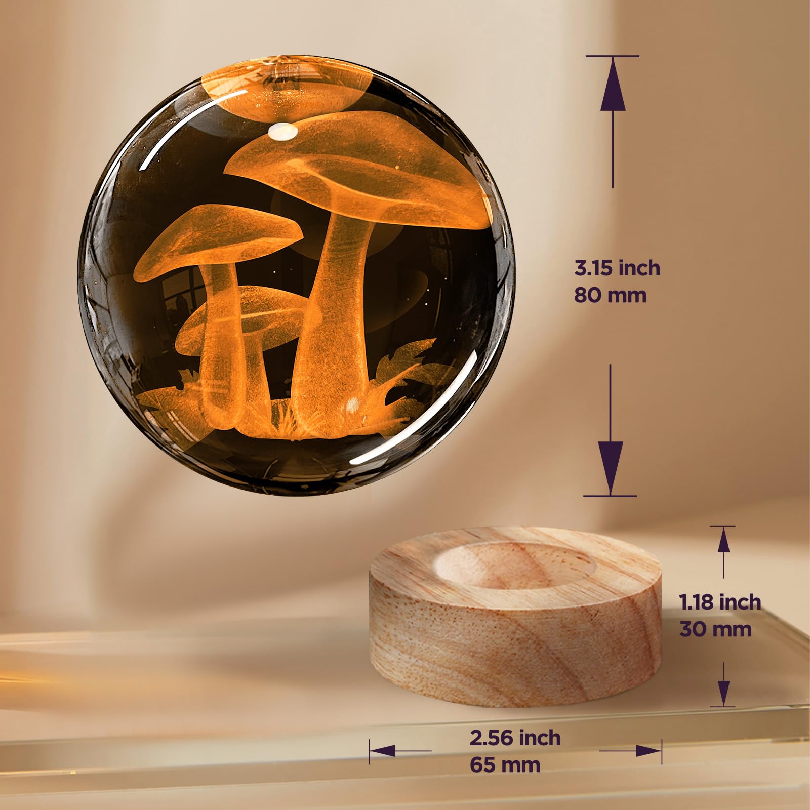 🔮【3.15 Inch Large Mushroom Crystal Ball】By upgrading, the diameter of the crystal ball is 3.15 inches(8cm). The weight is about 0.65kg (1.43 pounds). Equipped with a wooden base, the crystal ball can be stably placed on the wooden base.