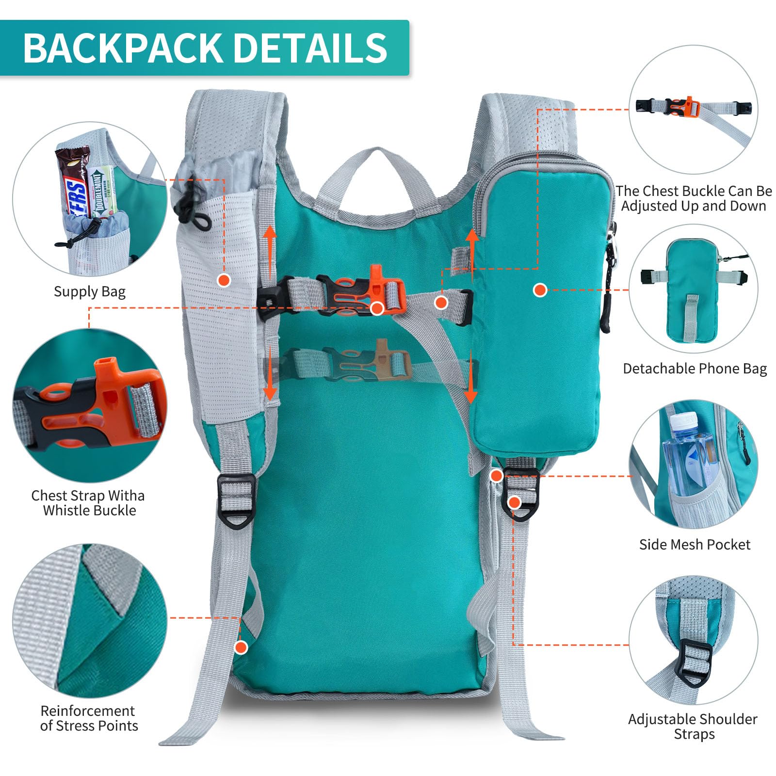 PORTABLE CELL PHONE BAG: the left shoulder strap of the hiking backpack for women is equipped with a cell phone bag with zipper, and it can be removed, it is enough to hold 1 7-inch cell phone, the right shoulder strap is equipped with an elastic bag with drawstring, which can hold snacks, water bottles and other hiking use, easy to take.