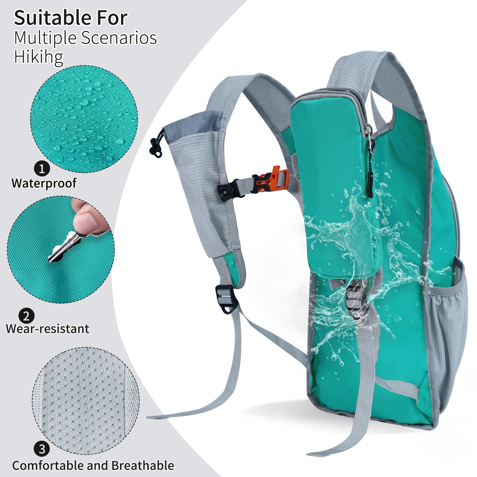 HIGH-QUALITY MATERIALS: the day hiking backpack is made of high-density polyester waterproof fabric and high-quality zippers, the shoulder strap is made of breathable fabric, reinforced at the stress point, durable and not easy to tear, outdoor hiking, even if it rains, it will not wet important items inside the Small hiking backpack.