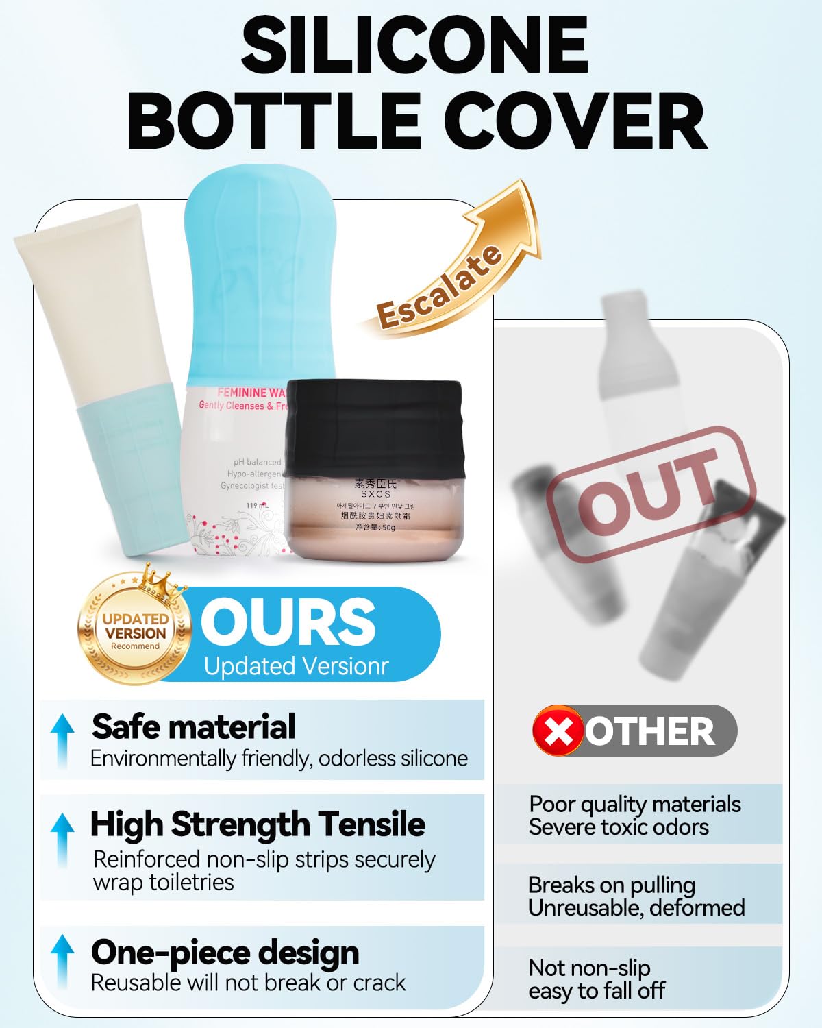 High Quality Travel Toiletries:This leak proof set of toiletries cover is made of high quality silicone material, which is highly elastic and can firmly wrap the toiletries, Elastic and can be reused.Leak-proof. It's a beach essentials,Cruise and vacation essentials.