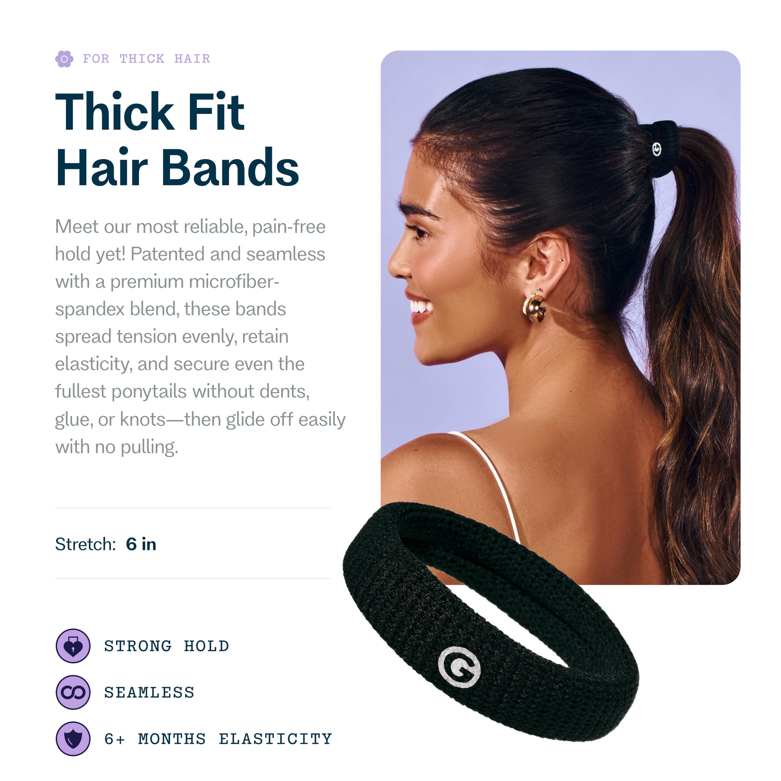 Gimme Beauty Thick Hair Extra Stretch Bands - Patent-Pending Design for Maximum Hold - Premium Ties for Thick & Curly Hair - Sleek & Strong Hold - Black, 6 Pack