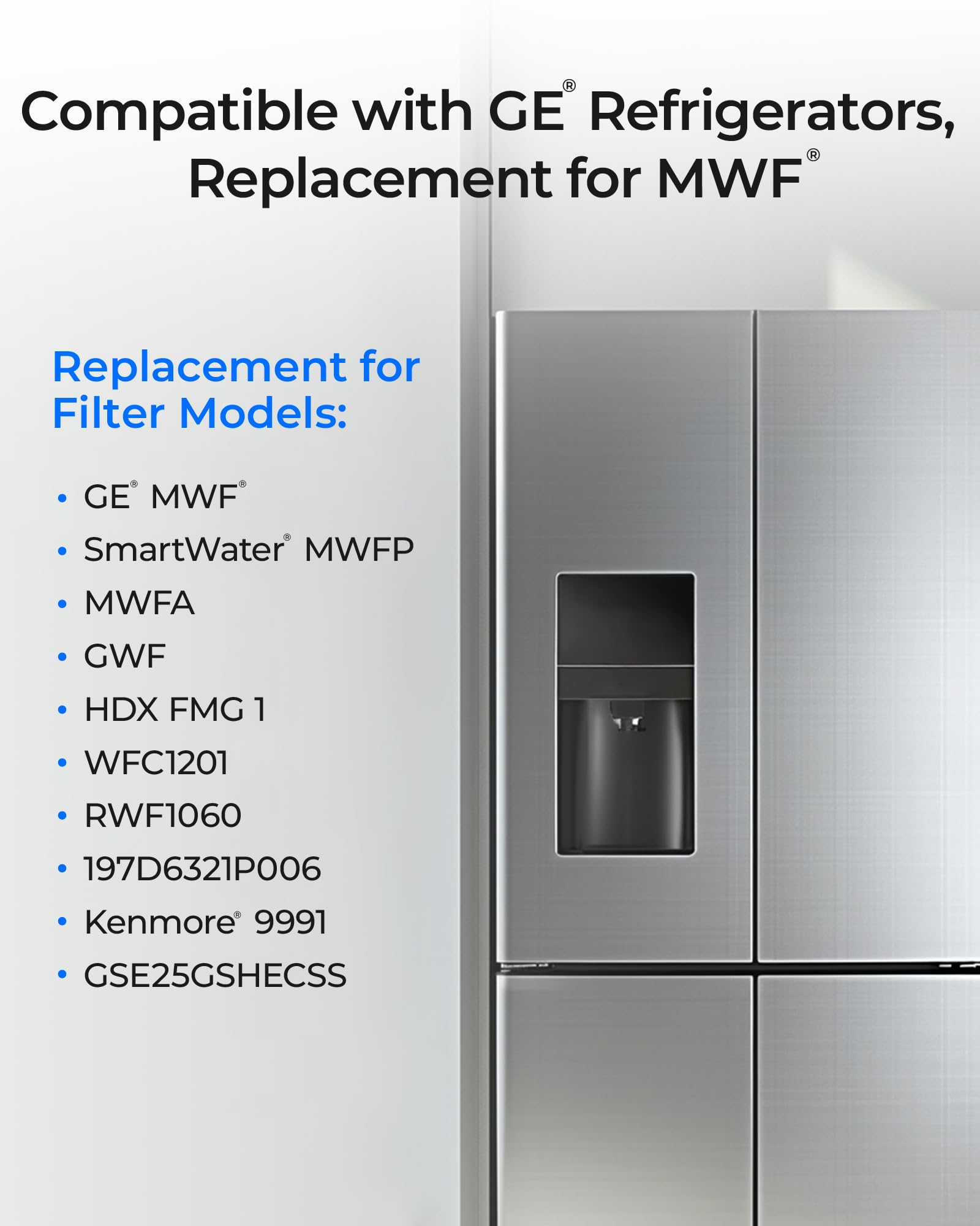[Replacement for] GWF, GWFA, GWF01, GWF06, MWFAP, MWFINT, HWF, HWFA, WMF, Kenmore 46-9991, 469991, 9991, 46 9991, 46-9996, 469996, 9996, 46 9996, PL-100, WD-F13, EBL7771, CF8, WFC1201, AQF-FF13, RWF0600A, RWF0600AH, PP-RWF0600A, FL-RF13, WS613B, MB-F13, PF8, RWF1060, CWMF031, WSG-1,CLCH102, GE MWF, CW-G1.GE is a registered trademark of General Electric Company. GE is used for reference purposes only.