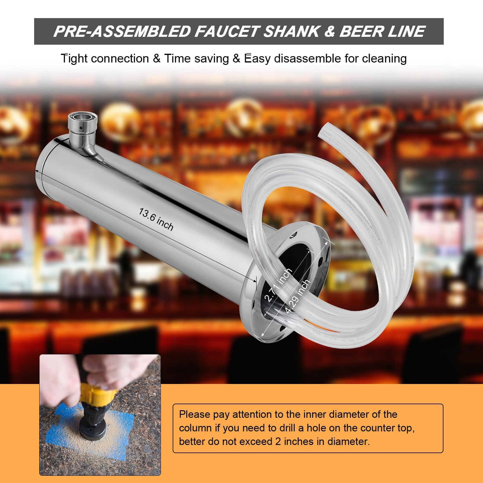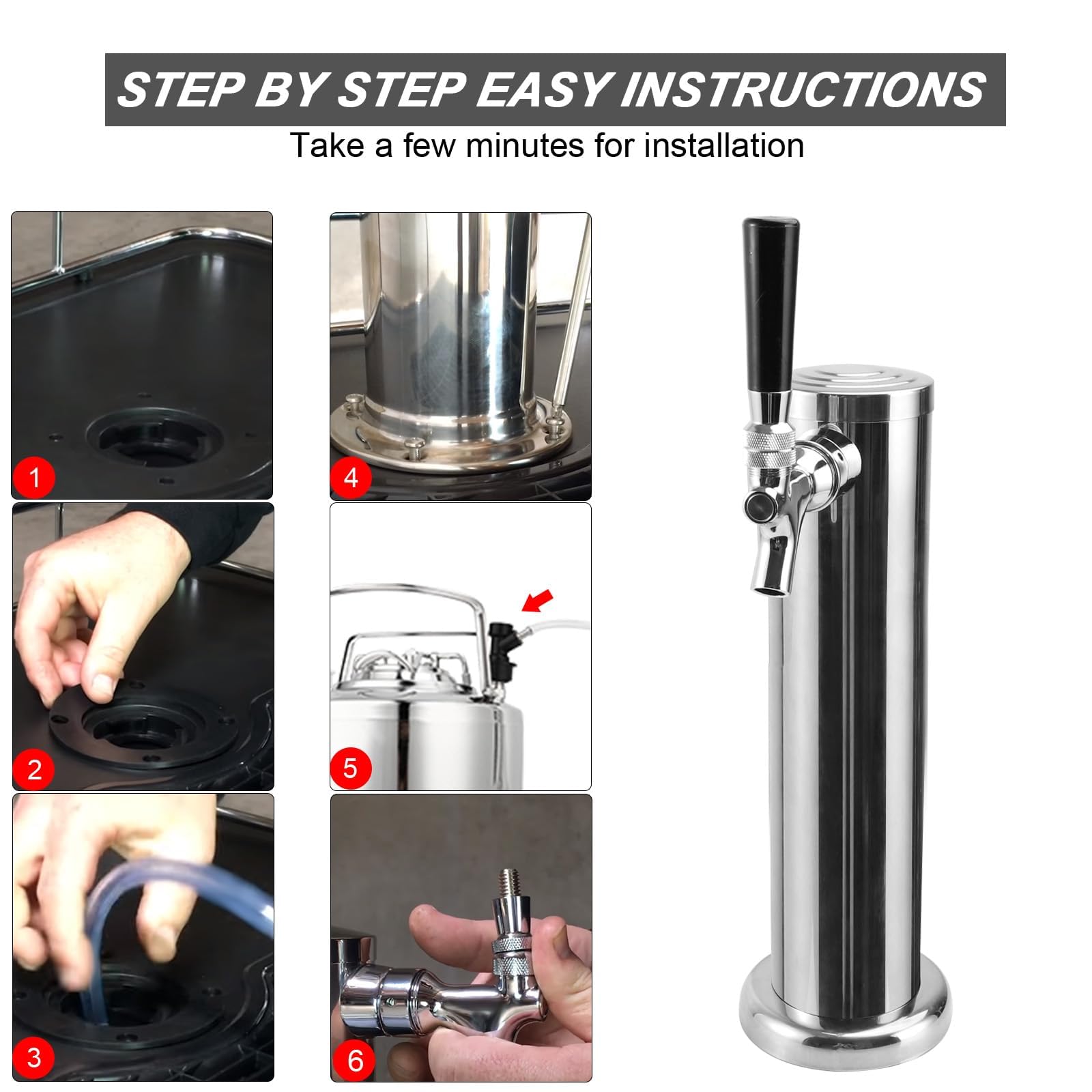 Few Minutes for Easy Installation Convenient Kit: Pre-assembled faucet shank and beer line to save you time. 1. install this on a bar counter: drill holes on the countertop for tubing and screws, place the gasket, pass the tubing through the hole, use screws to fix the tower, and install the faucet. 2. Install on a kegerator would be easier: use the m5/m6 screws to fix the tower directly, no drills are needed