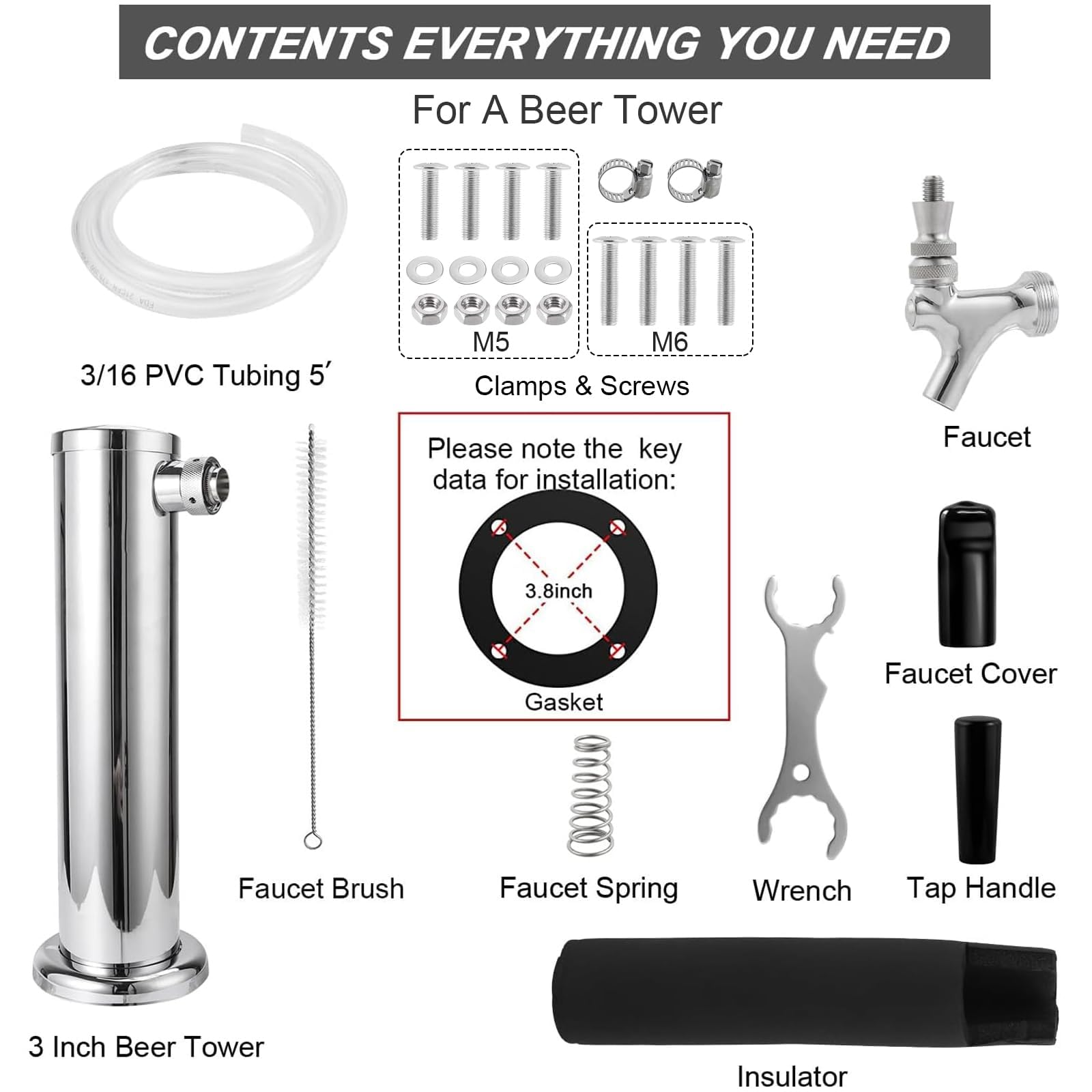Contents Everything You Need For A Beer Tower: Comes with stainless steel column, brass faucet, 5 feet 3/16" I.D. tubing, beer tower gasket, M5 screws & nuts of 4, clamp, beer faucet spring, beer faucet soother, beer tap wrench, and 1 cleaning brush. A complete beer dispenser tower